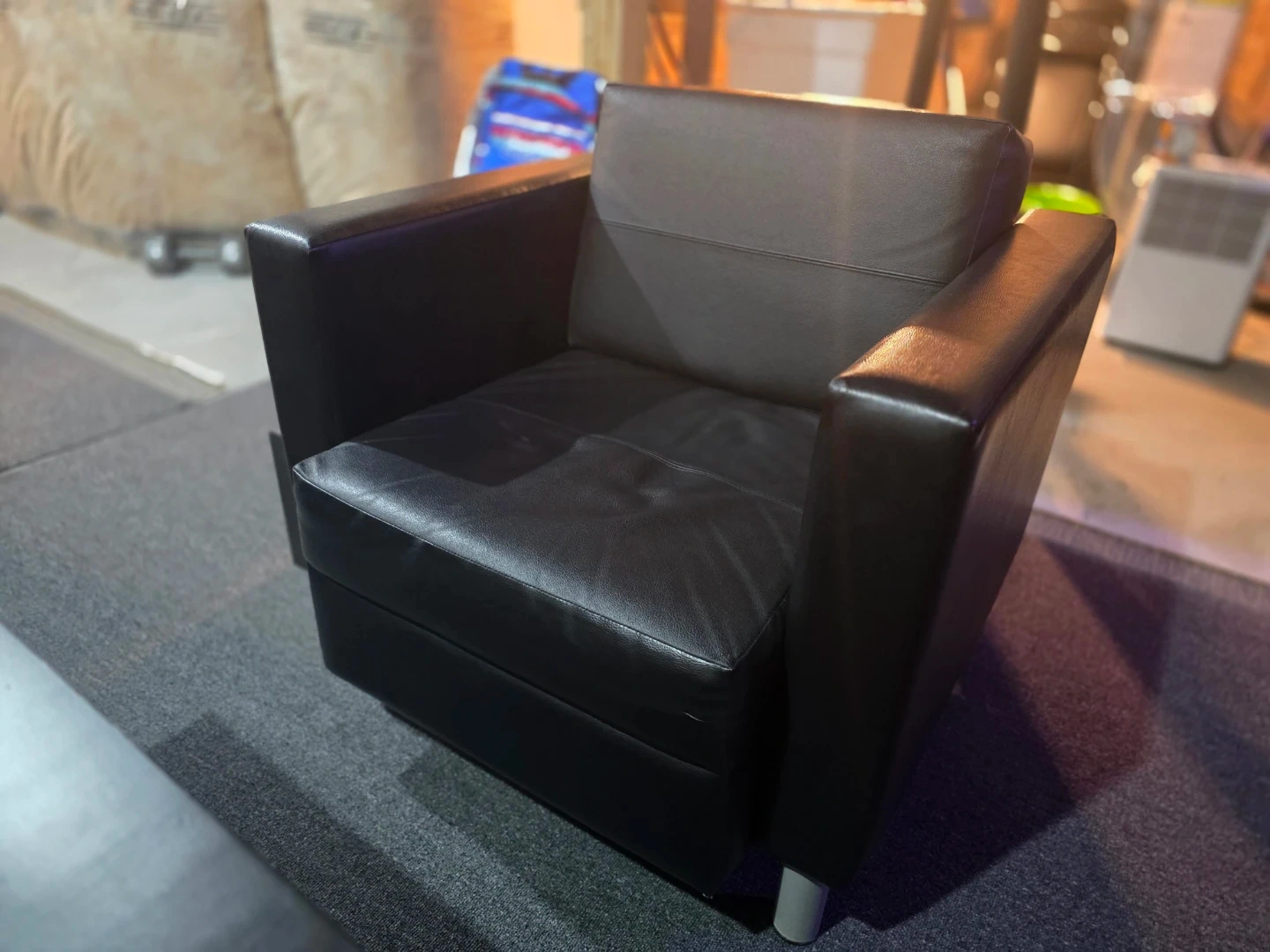 A modern armchair upholstered in black faux leather. It has a square design with tufted seat cushions. Silver-toned feet support the chair.