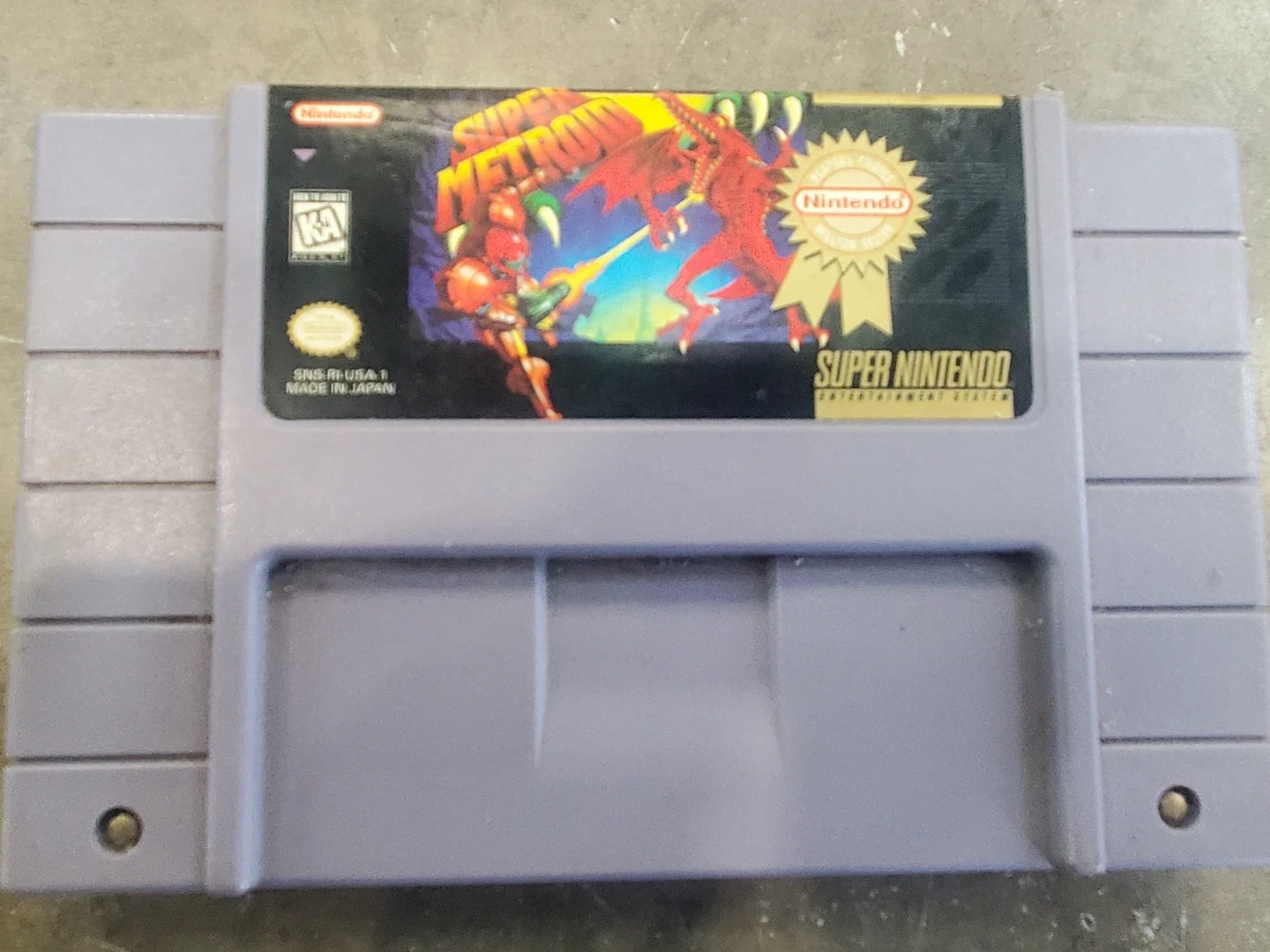 This is the Super Metroid game cartridge for the Super Nintendo Entertainment System. It's the US version and was made in Japan. This game is rated E for Everyone.