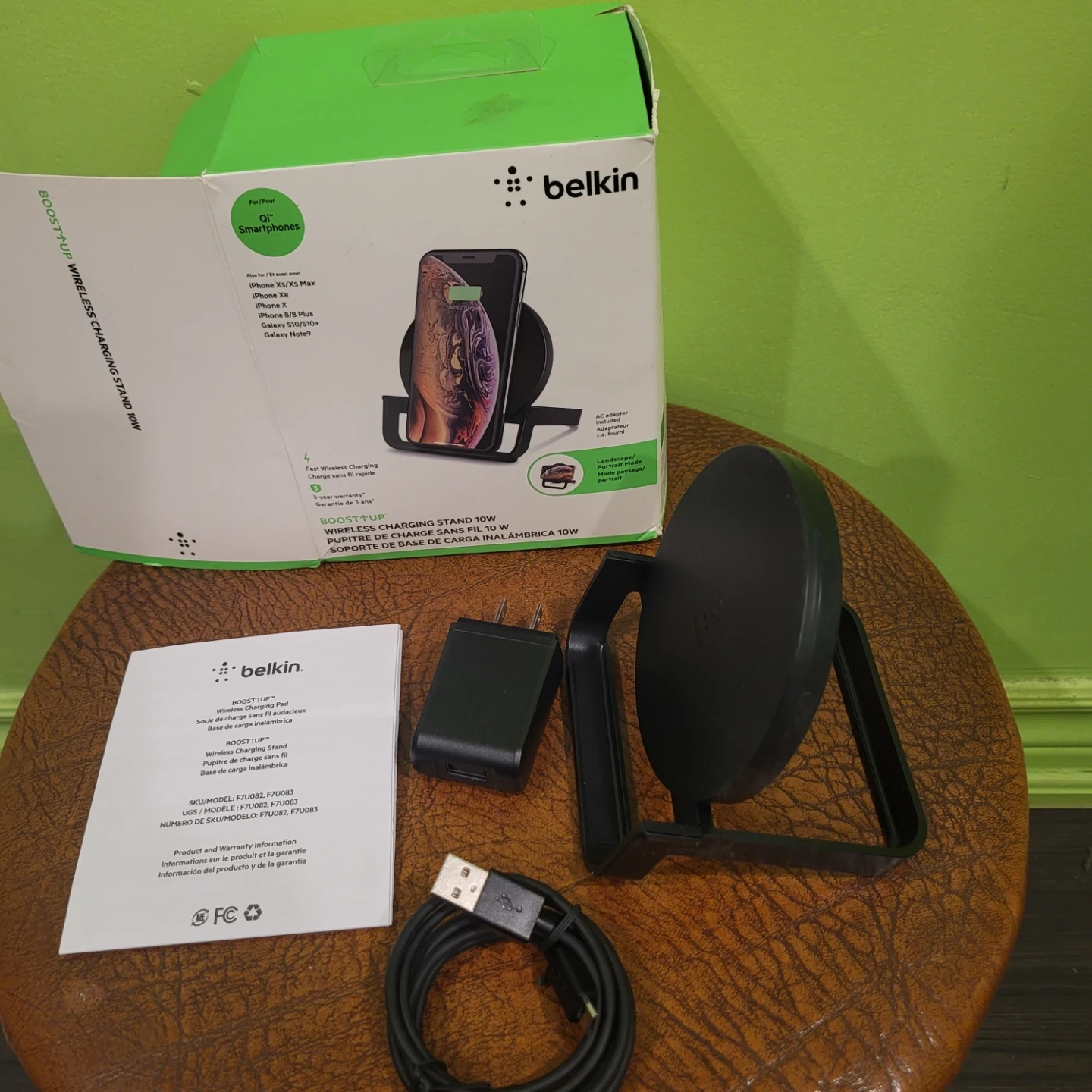 This is a Belkin BOOST↑UP wireless charging stand that delivers 10W of power. It supports Qi-certified smartphones and includes the charging stand, a power adapter, and a USB cable. Fast wireless charging capabilities are supported.