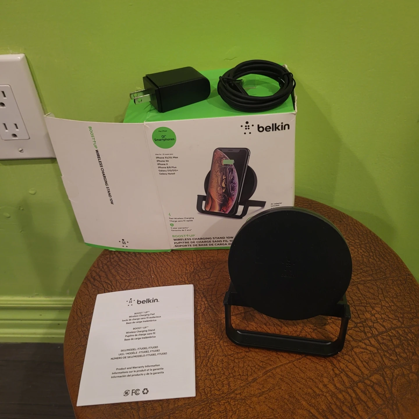 This is a Belkin BOOST↑UP wireless charging stand that delivers 10W of power. It supports Qi-certified smartphones and includes the charging stand, a power adapter, and a USB cable. Fast wireless charging capabilities are supported.