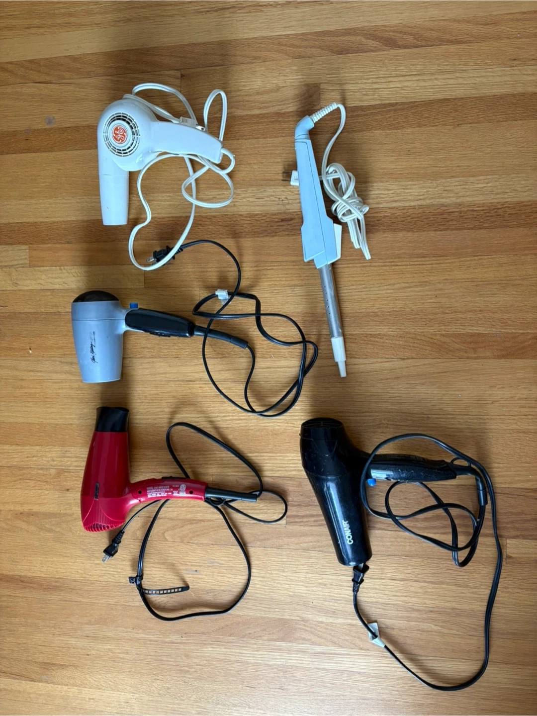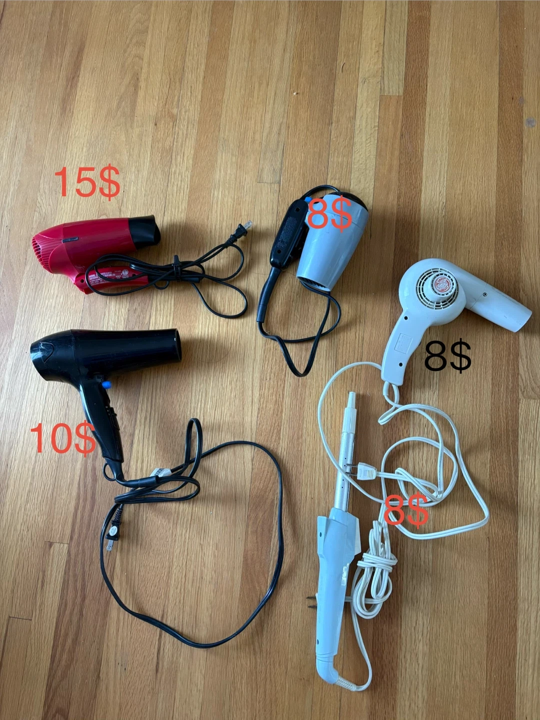 Selling a collection of hair dryers and one styling tool. Includes a red compact dryer, a grey dryer, a white compact dryer, a black full-size dryer, and a light blue styling tool. Prices vary per item.pickup at Morley trail NW