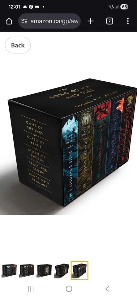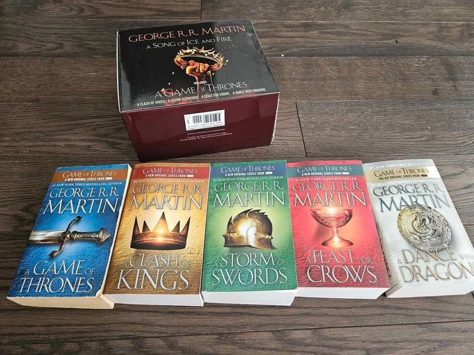 The whole set of George R. R. Martin's A Game of Thrones (Song of Ice and Fire Series): A Game of Thrones (used), A Clash of Kings (used like new), A Storm of Swords (new), A Feast for Crows (new), and A Dance with Dragons (new). Pet free and smoke free home.