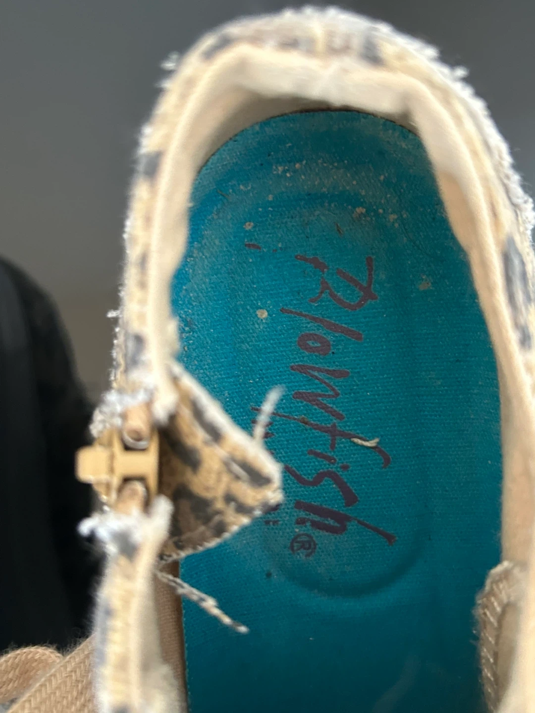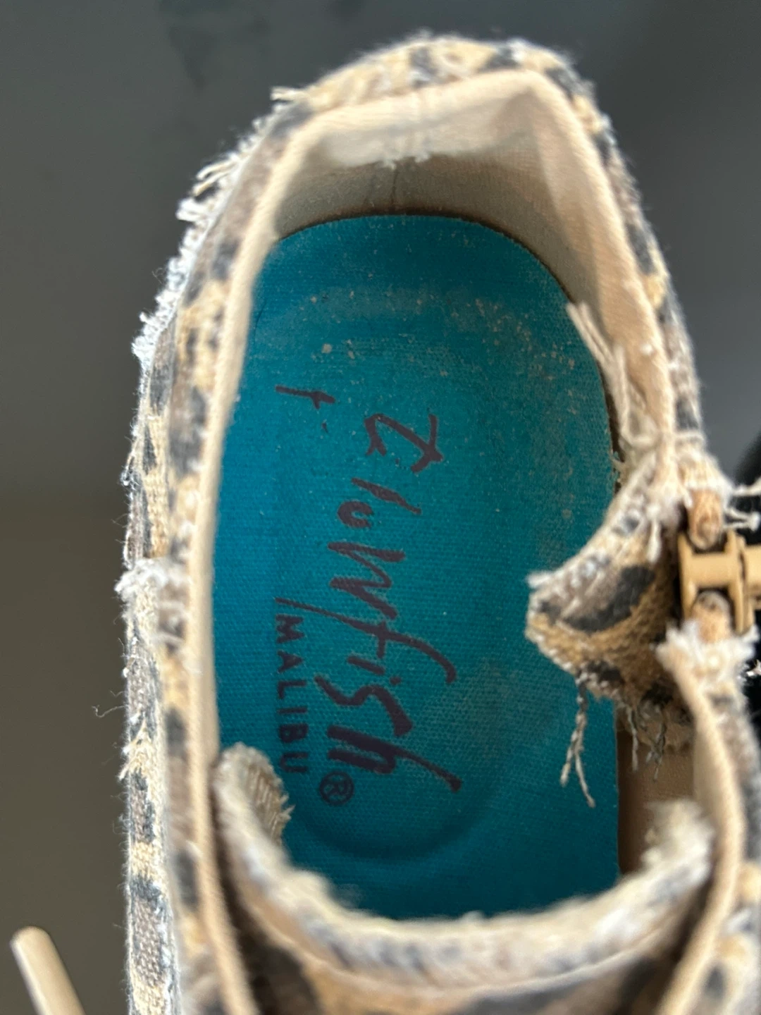Blowfish Malibu sneakers with a fun leopard print design. They're a size 6, featuring a 100% cotton upper and synthetic sole. Side zippers make 'em easy to slip on!