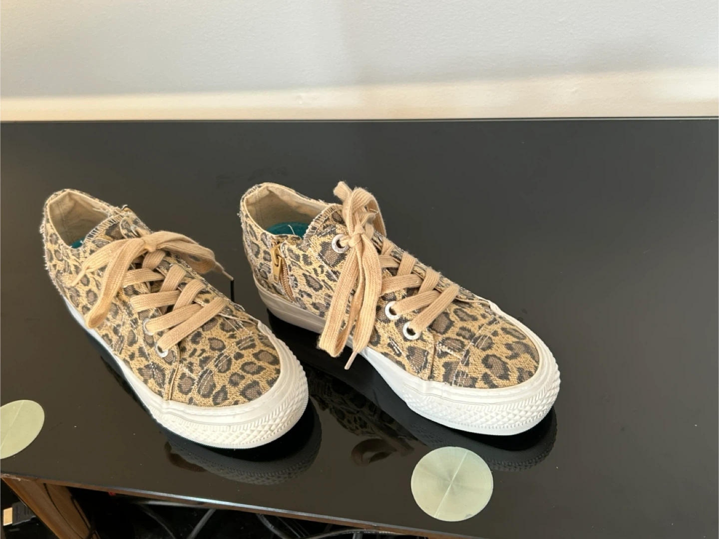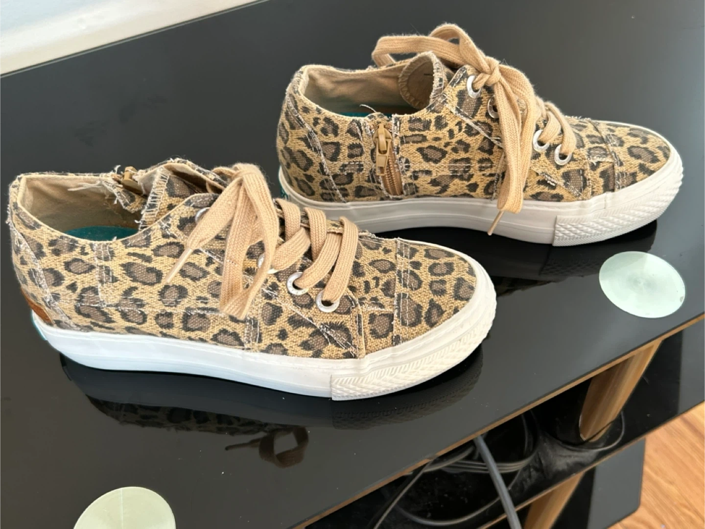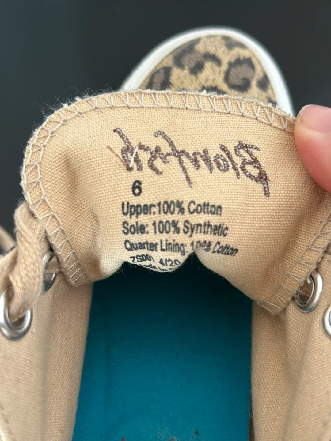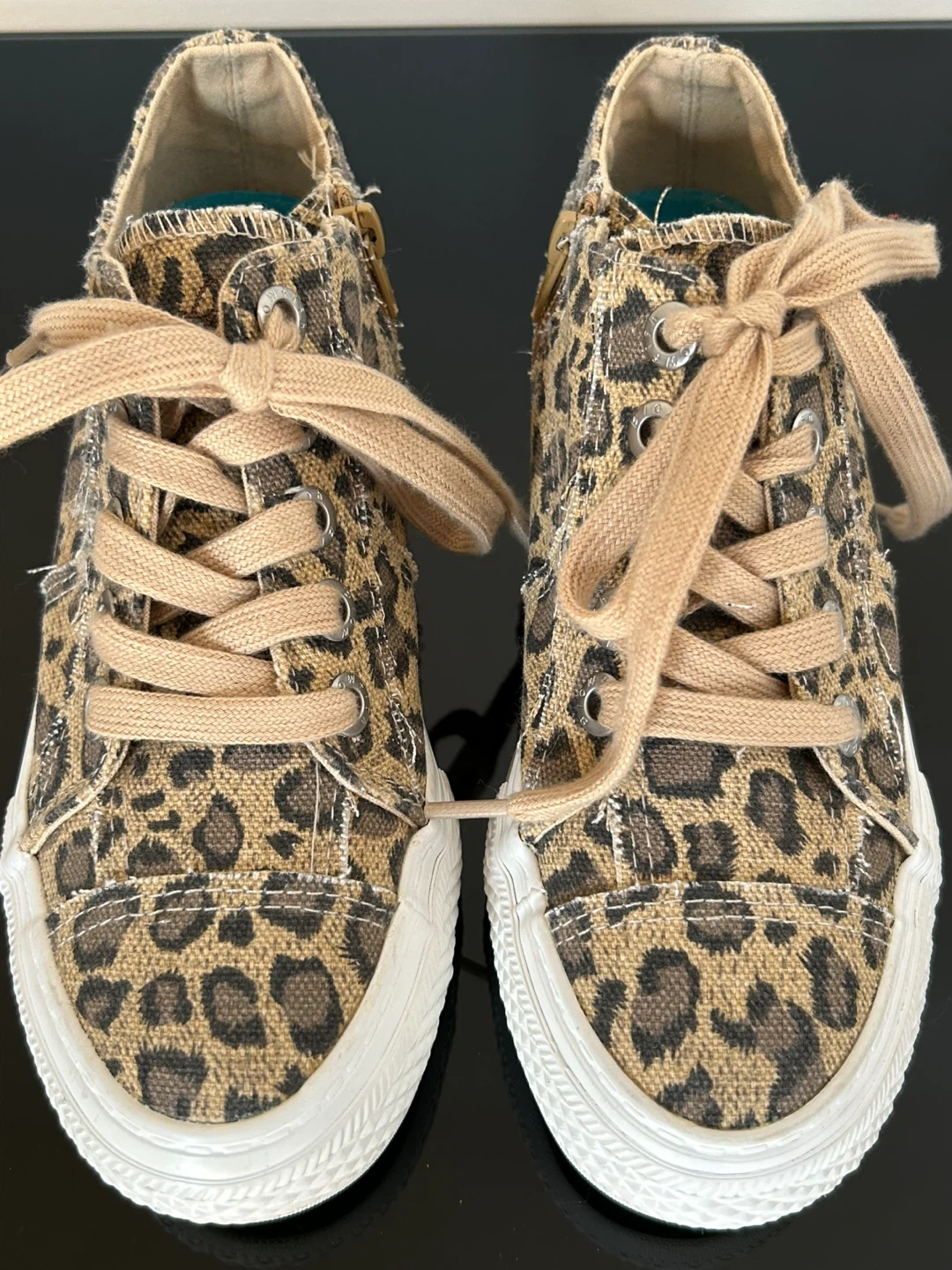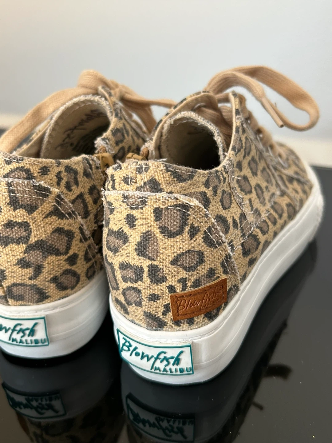 Blowfish Malibu sneakers with a fun leopard print design. They're a size 6, featuring a 100% cotton upper and synthetic sole. Side zippers make 'em easy to slip on!