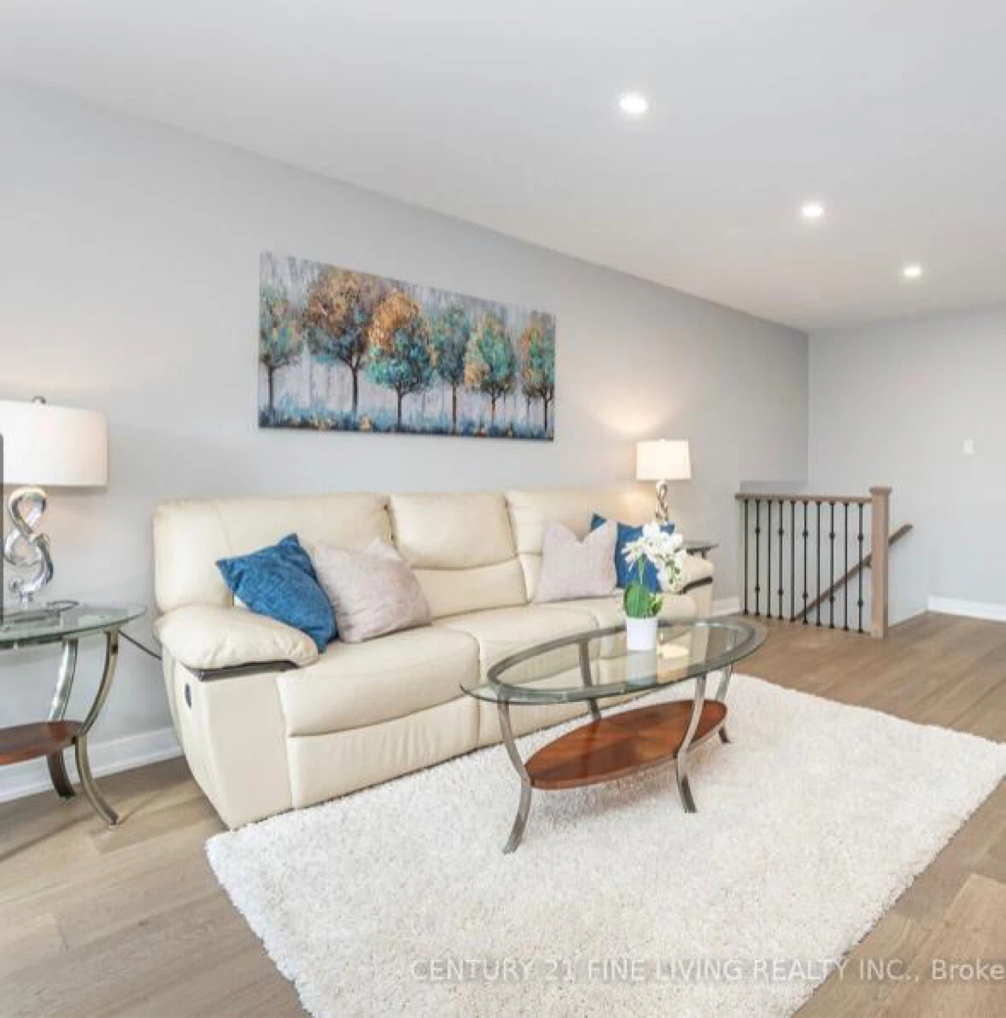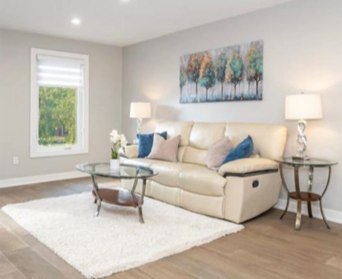 Cream leather reclining sofa with plush cushions. It's a comfortable seating option for any living space. Includes power recline functionality. Pick up Thornhill