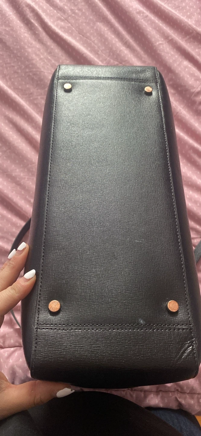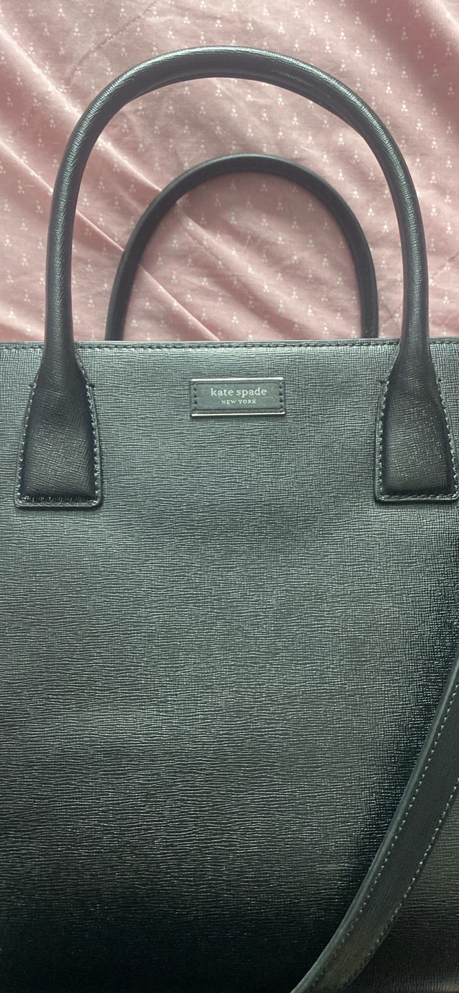 This is a black leather tote bag from Kate Spade New York. It features a textured leather exterior and a zippered main compartment with interior pockets. Includes a removable crossbody strap. Bag has protective metal feet on the bottom.
