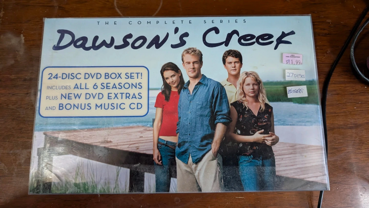 This is the complete series DVD box set for Dawson's Creek. It includes all 6 seasons and 24 discs. There are also new DVD extras and a bonus music CD included. This set contains all 127 episodes.
