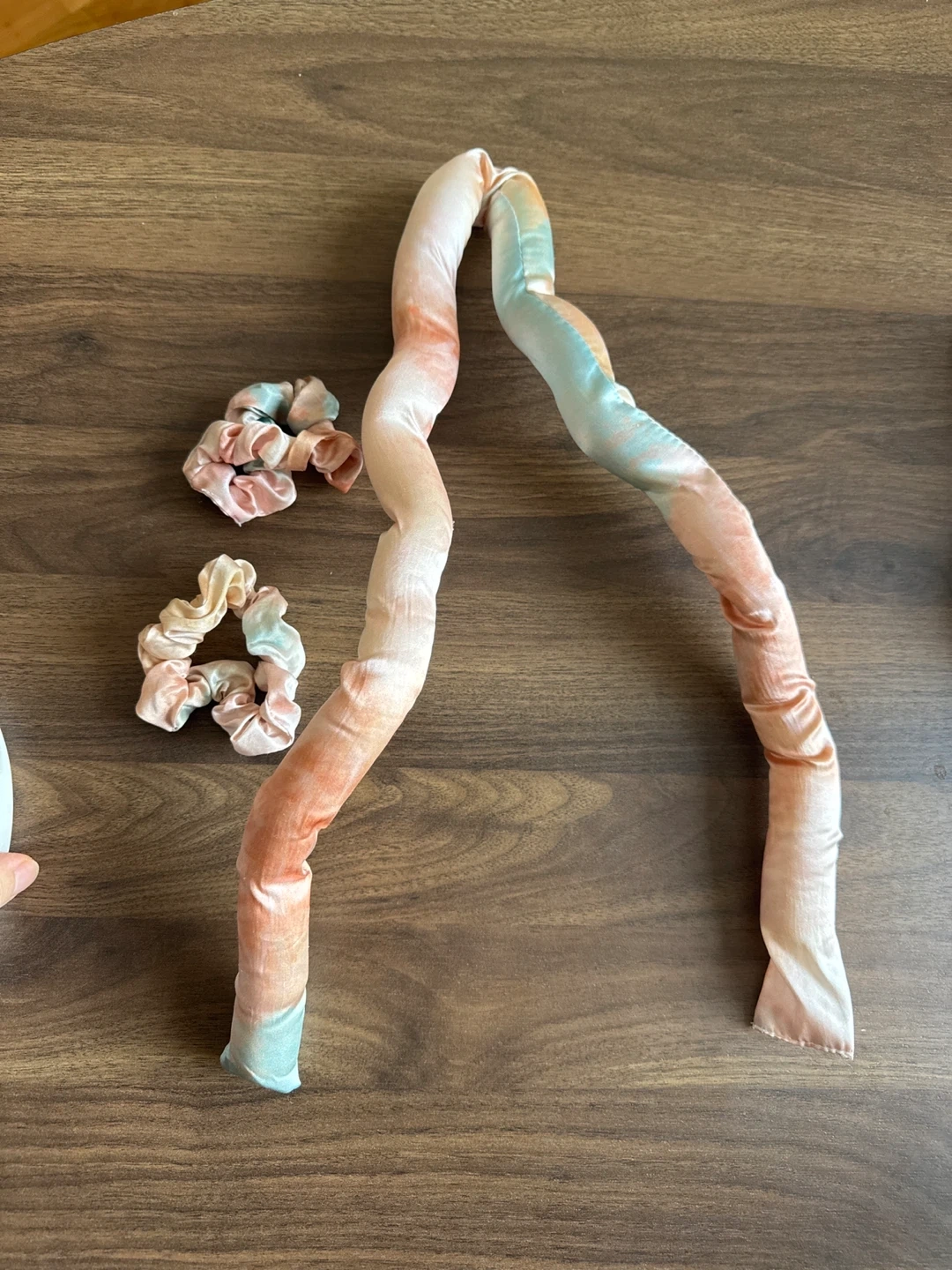 This set includes a heatless curling rod and two scrunchies. They're made from a soft, silky material in a tie-dye pattern of pink, orange, and blue. Great for creating gentle waves without heat! From Kitsch! Pick up available in downtown.