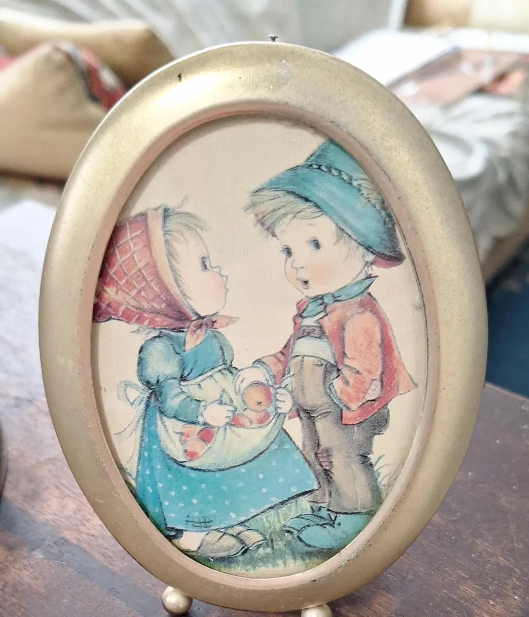 This charming oval frame features a vintage-style illustration of two children. It has a gold-toned metal finish and a small easel stand. It's a lovely decorative piece for any room!