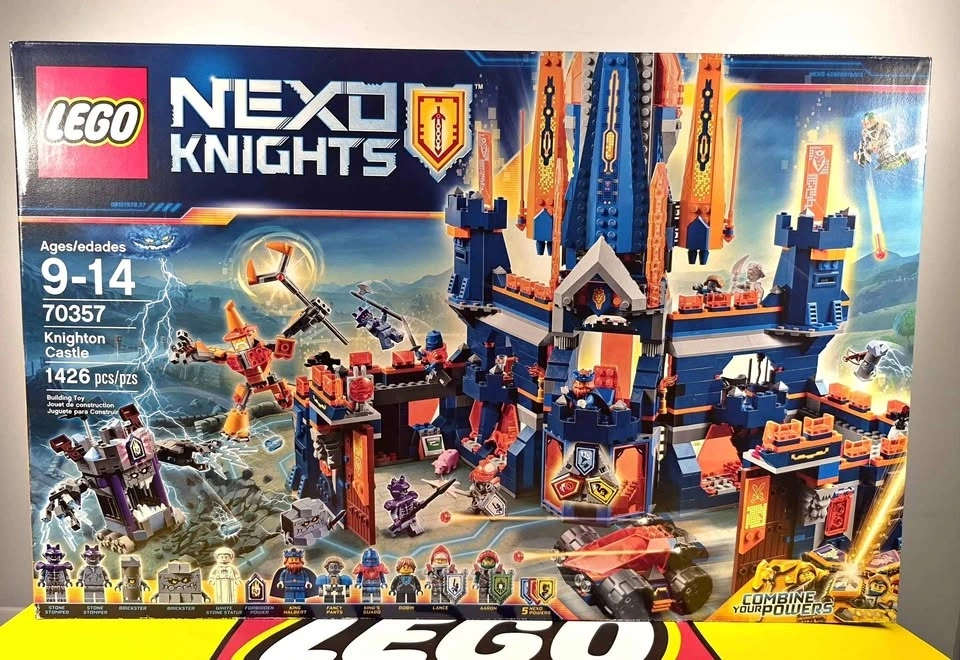 Knighton Castle is the primary stronghold of Knighton, featuring a multi-level fortress with opening drawbridge, rotating towers, prison cell, armory, and catapult. The set includes a removable flying castle section, interactive play functions, and a large assortment of Nexo Knights minifigures and buildable enemy creatures, designed for large-scale display and extended role-play scenarios.