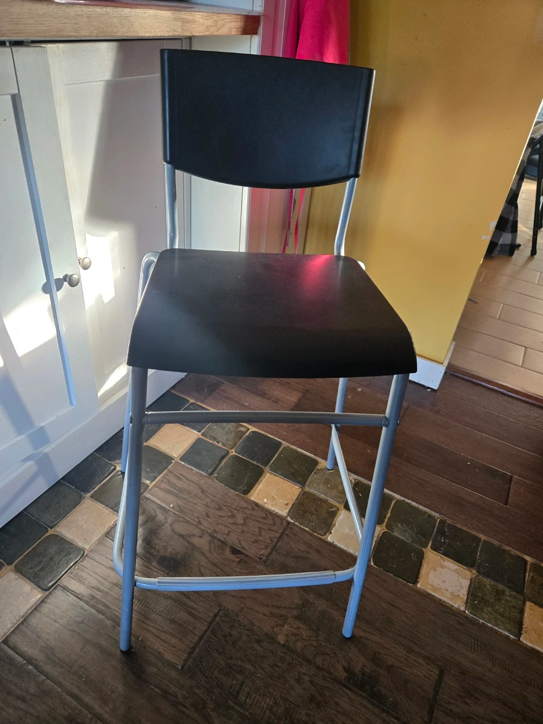Buy & SellBlack Bar StoolBlack Bar Stool$15This is a black bar stool with a metal frame. It has a padded seat and backrest. Its simple design fits most kitchen counters.ConditionLike newWHERE TO MEETCheck LocationView MapSELLERIraMoody Centre726 reviews0 chats·0 favorites·11 viewsSEND CHAT TO SELLERHi Ira! I’m interested in your listing.Hi Ira! I’m interested in your listing.Get the Karrot app to chatSign In to chat