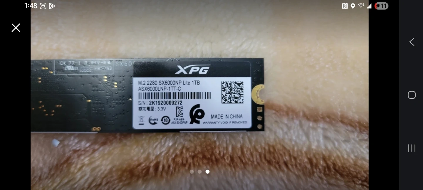 This is an XPG SX6000NP Lite 1TB NVMe M.2 SSD. It's a compact drive for fast storage. It's rated for DC 3.3V 2A.