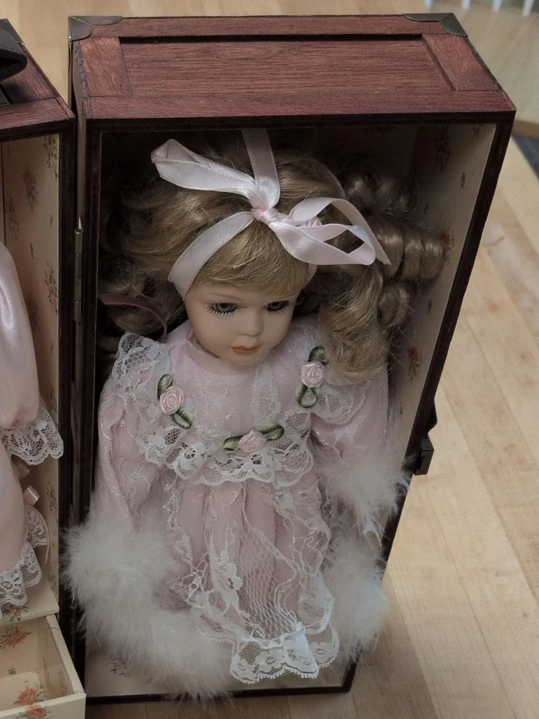A beautiful porcelain doll dressed in a detailed pink lace gown with white feather trim. It's presented inside a decorative wooden display case with a hinged lid. This doll makes a lovely decorative piece for any collector.