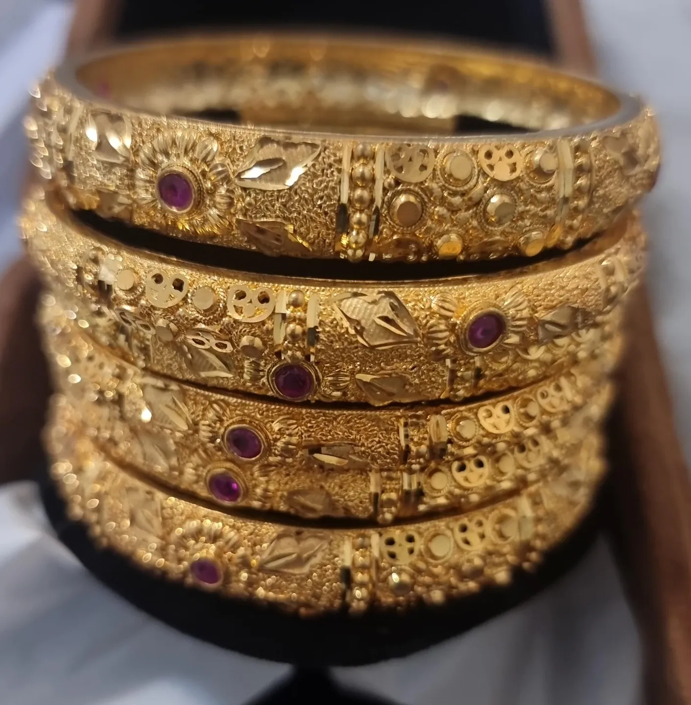 This set includes four intricately designed bangles. They feature a gold-tone finish and are adorned with small red stones. The detailed patterns add a touch of elegance.