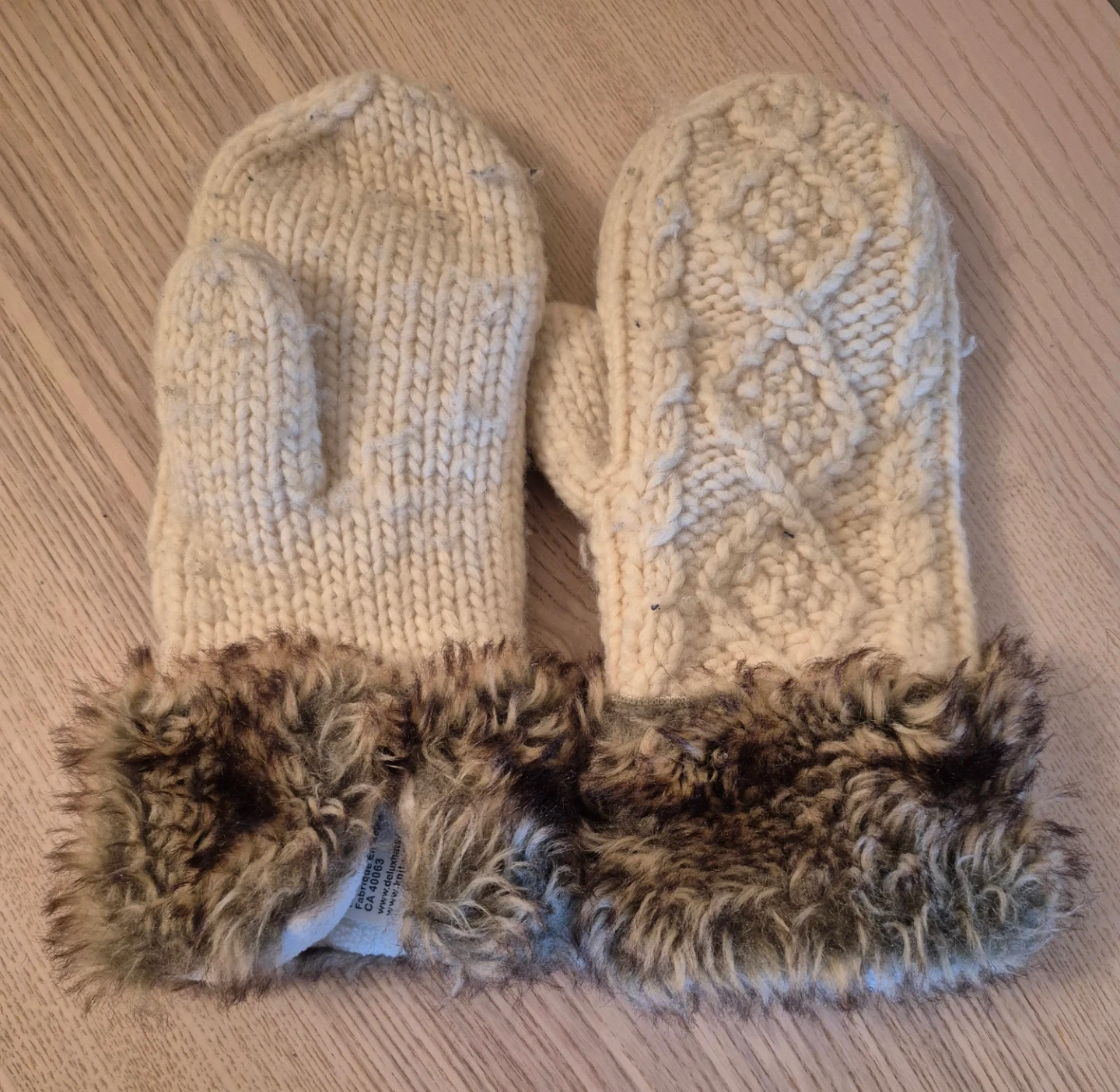 Cozy cream cable knit mittens featuring a warm faux fur trim at the cuffs. These mittens have a classic knit design with a cable pattern on the back of the hand. They're perfect for keeping your hands warm during colder weather.