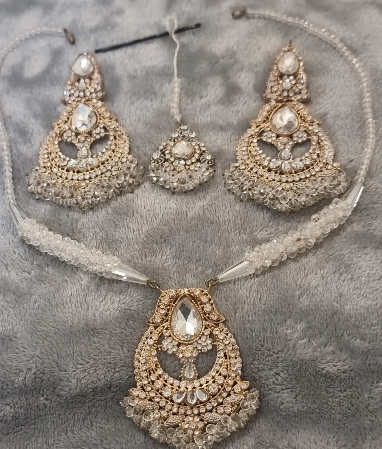 This is a beautiful gold-tone jewellery set. It includes a necklace and matching earrings, with a maang tikka also included. It's embellished with clear white stones and small beads.