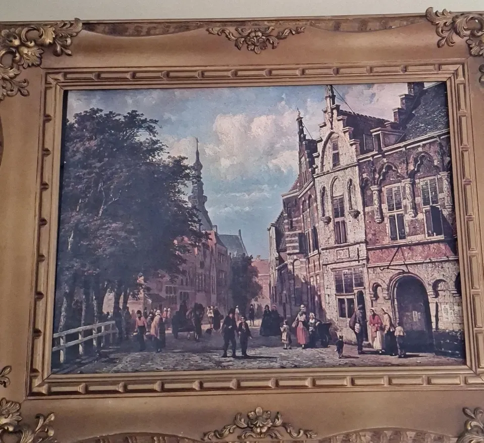 This is a framed painting depicting a bustling European street scene with people and historic buildings. It's an attractive piece that adds character to any room. The artwork is set in an ornate gold-colored frame.