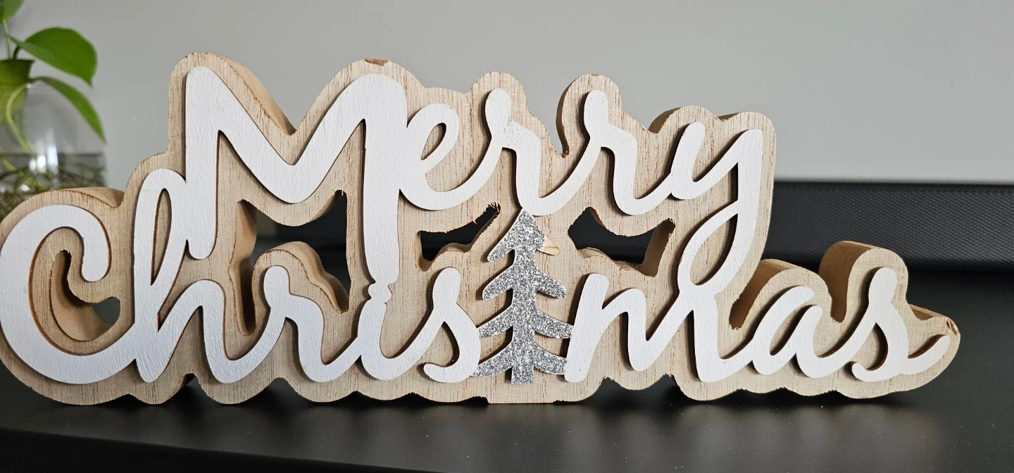 This layered wooden sign says Merry Christmas with a cute glitter tree accent. It's made of natural wood with white painted lettering for a festive look. This decoration is great for adding holiday cheer to any mantel or shelf!