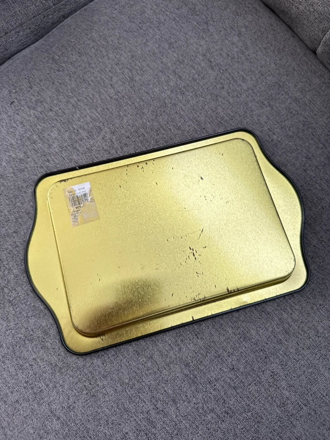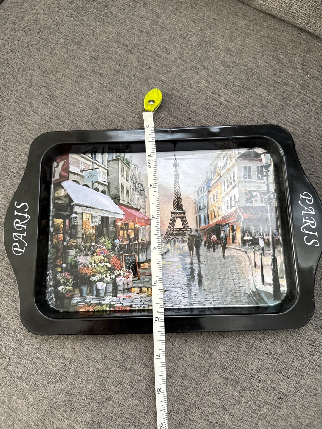This decorative metal tray features a charming Paris scene with the Eiffel Tower. It's great for serving snacks or displaying small items. The tray measures approximately 11 inches long and 7.5 inches wide.