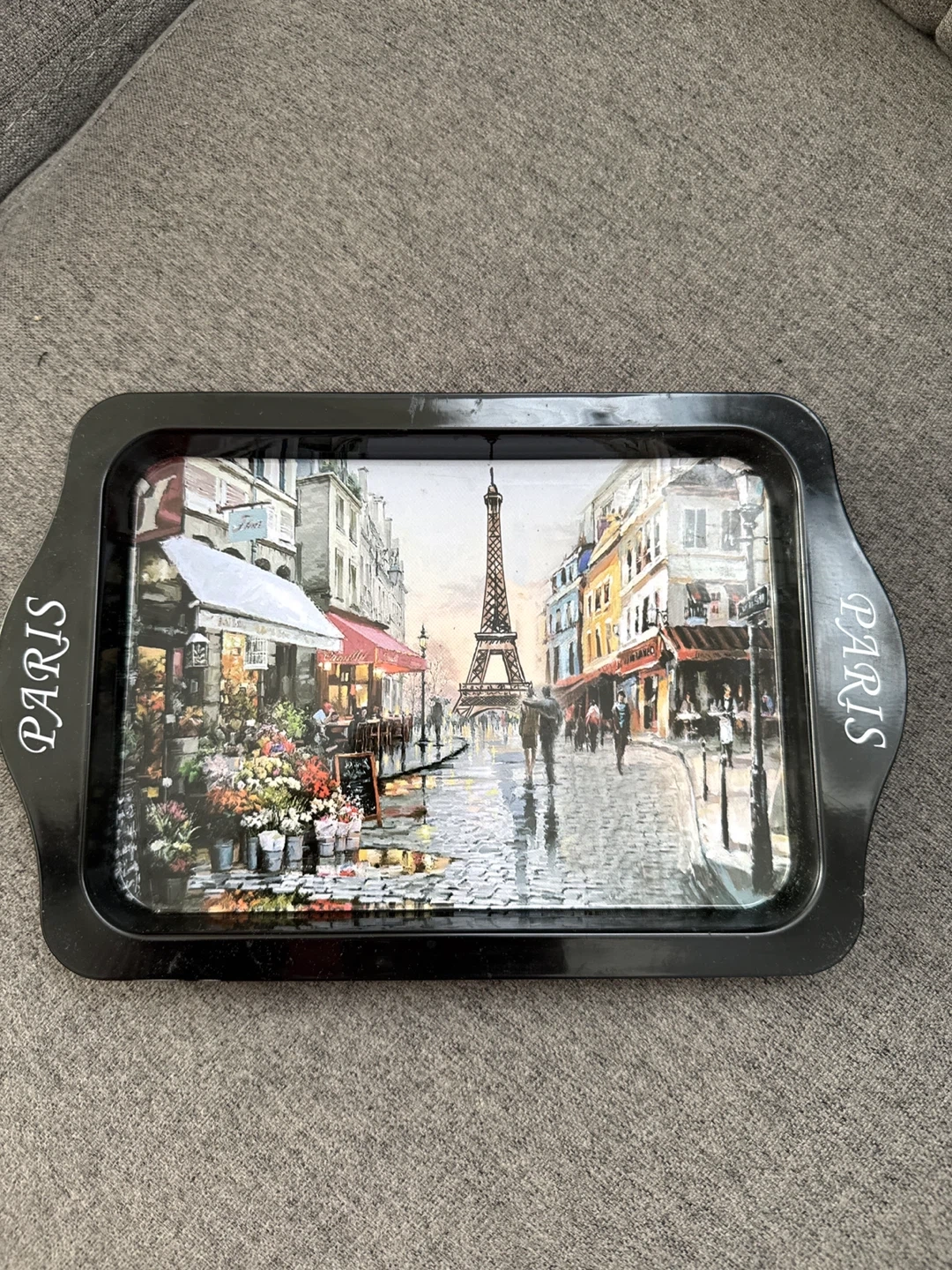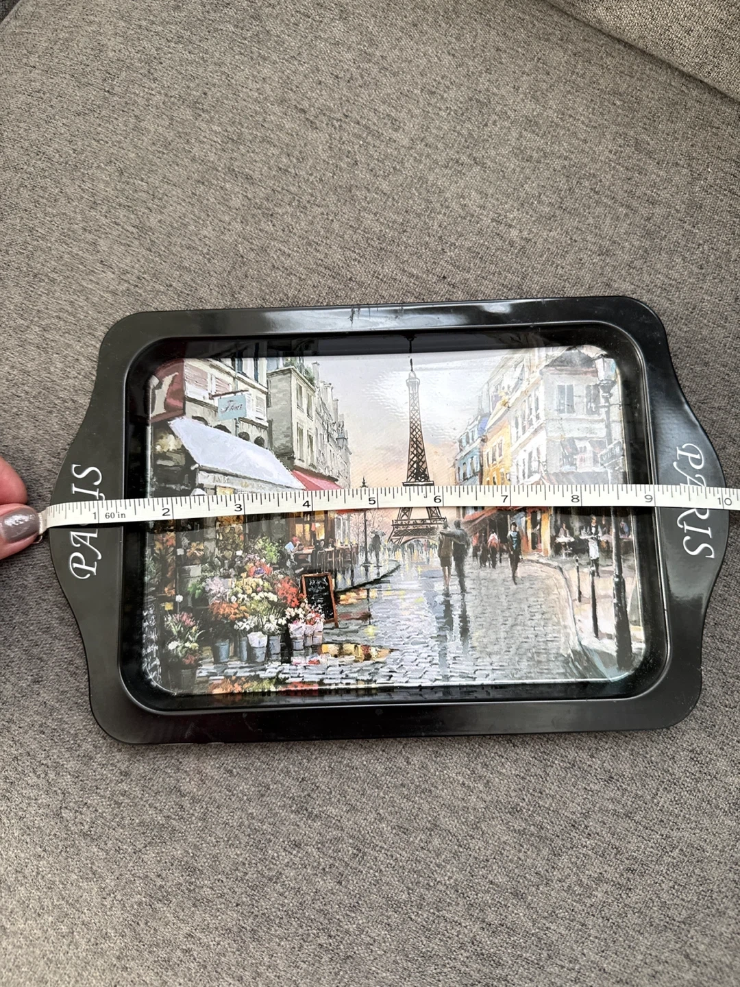 This decorative metal tray features a charming Paris scene with the Eiffel Tower. It's great for serving snacks or displaying small items. The tray measures approximately 11 inches long and 7.5 inches wide.