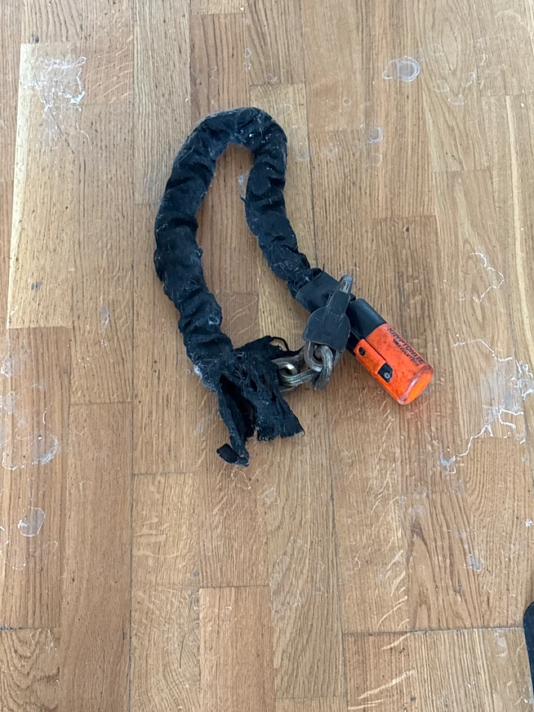 This is a heavy duty Kryptonite bike chain lock. It's black with an orange locking mechanism. Features a durable chain for securing your bike.