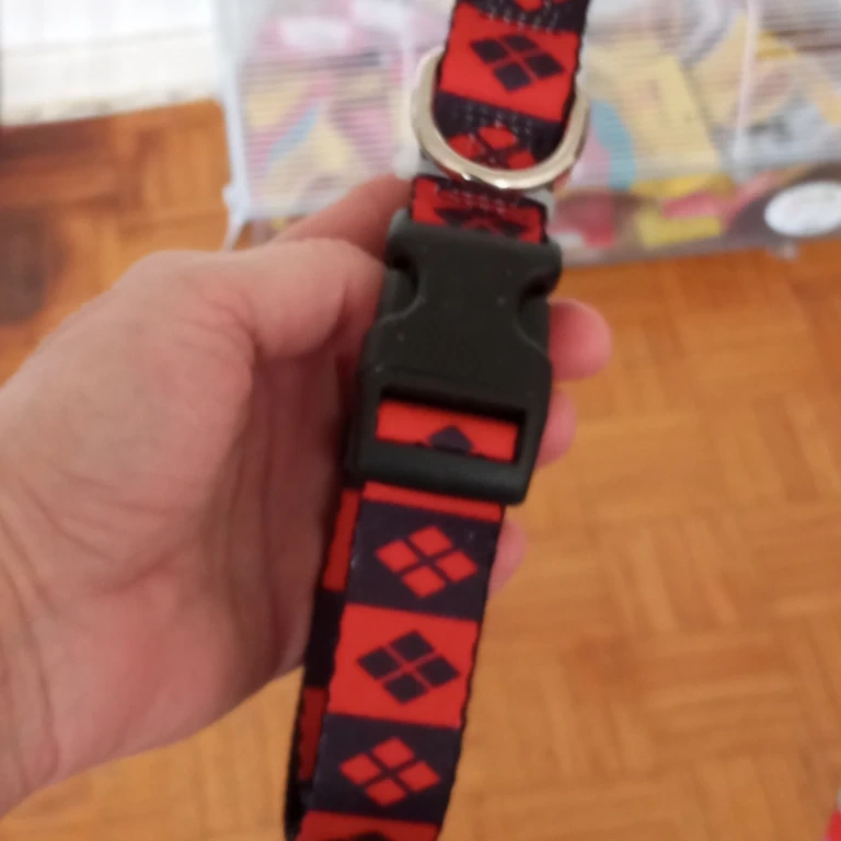This dog collar features a red and black pattern with small diamond shapes. It has a sturdy black buckle for secure fastening. It's made of durable fabric material.