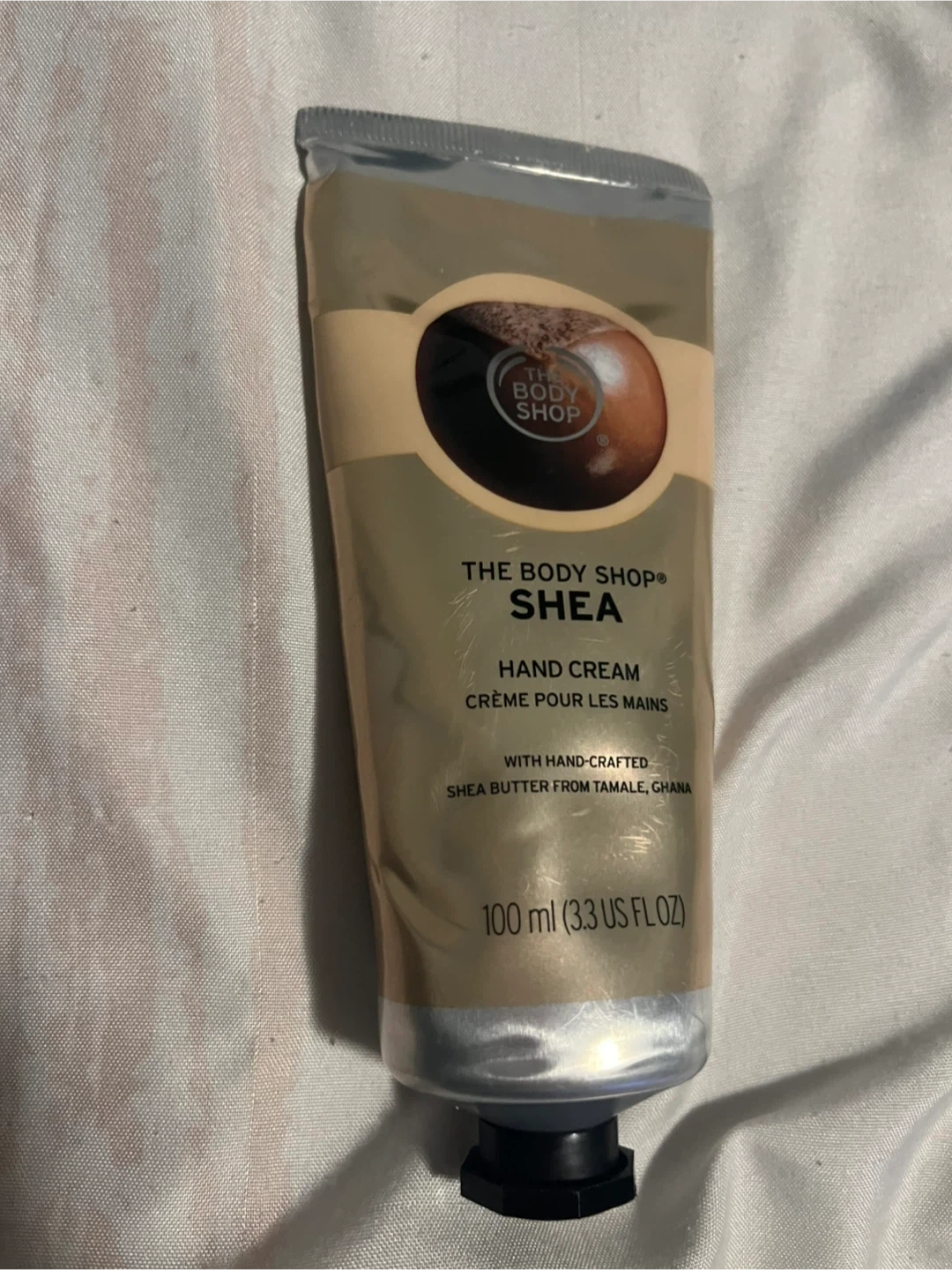 This is The Body Shop Shea Hand Cream. It's made with hand-crafted shea butter from Tamale, Ghana. The tube contains 100 ml (3.3 US fl oz) of cream.