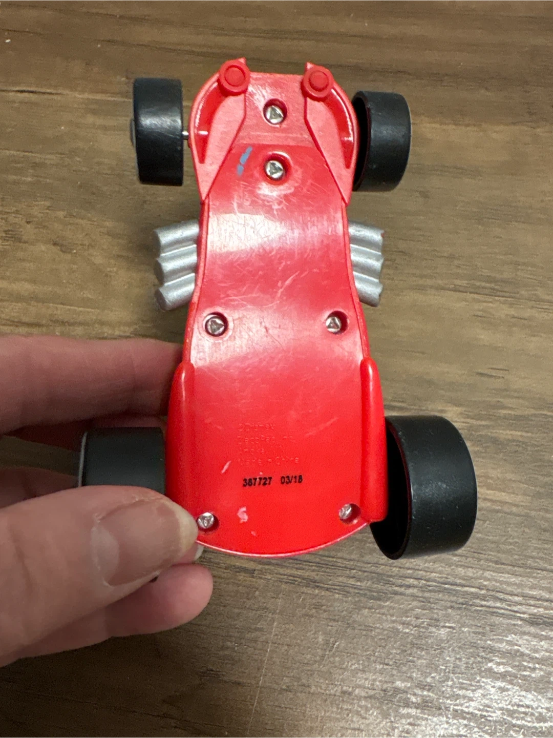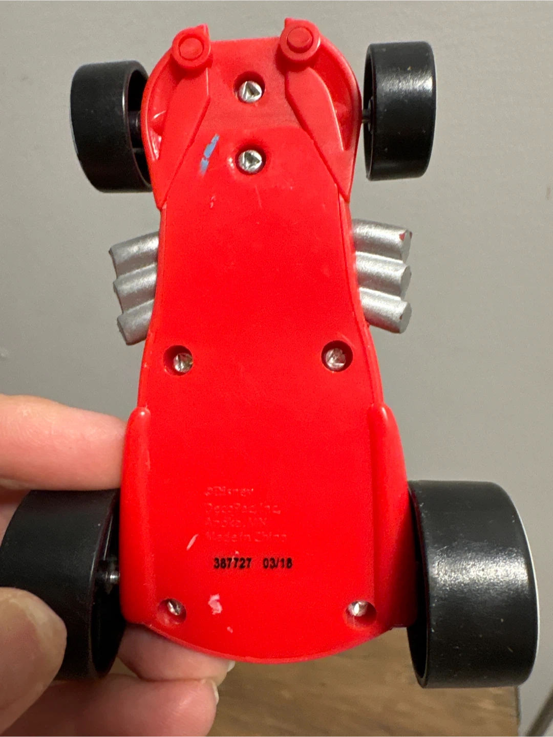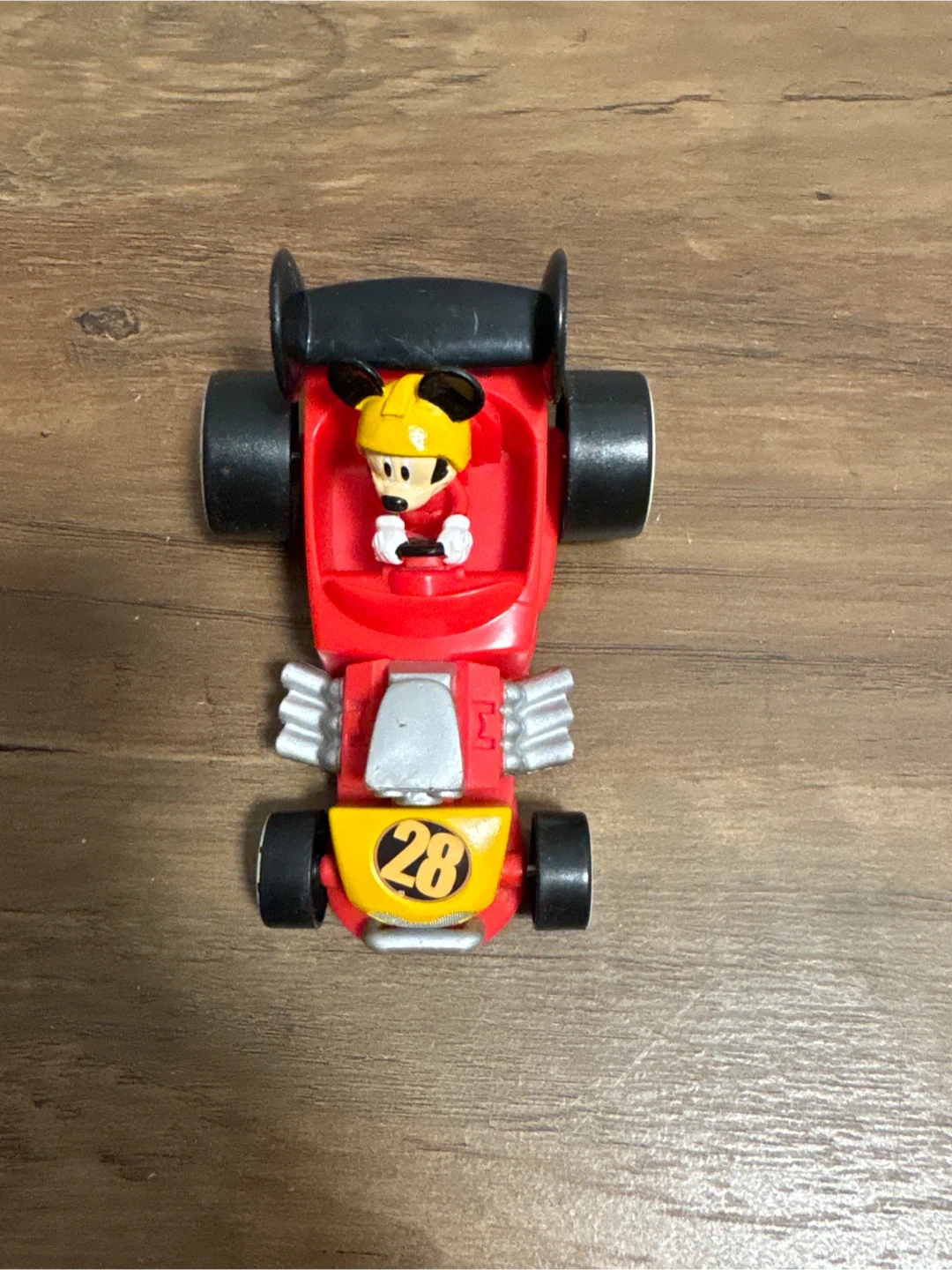 This is a fun Mickey Mouse race car toy. It features Mickey in the driver's seat with a yellow helmet and a red racing suit. The car itself is red with black racing tires and a yellow front with the number 28. It's a classic character collectible!