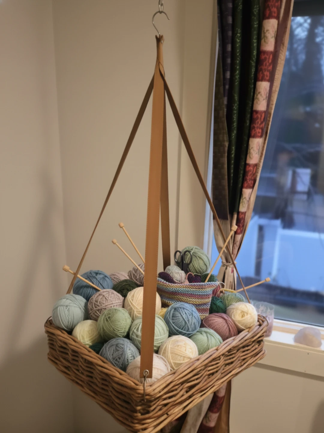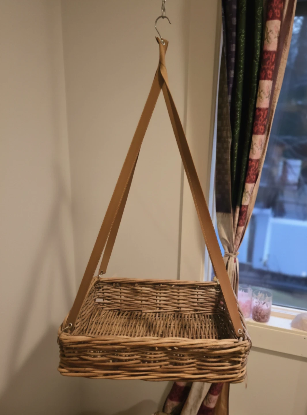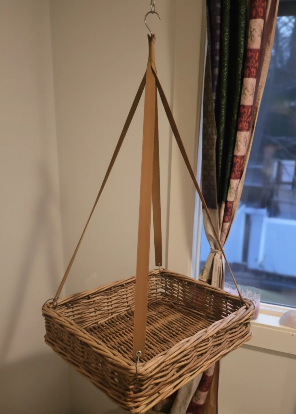 A lovely square wicker basket, perfect for hanging. It comes with sturdy tan leather straps for easy suspension. Ideal for storing craft supplies or displaying plants!