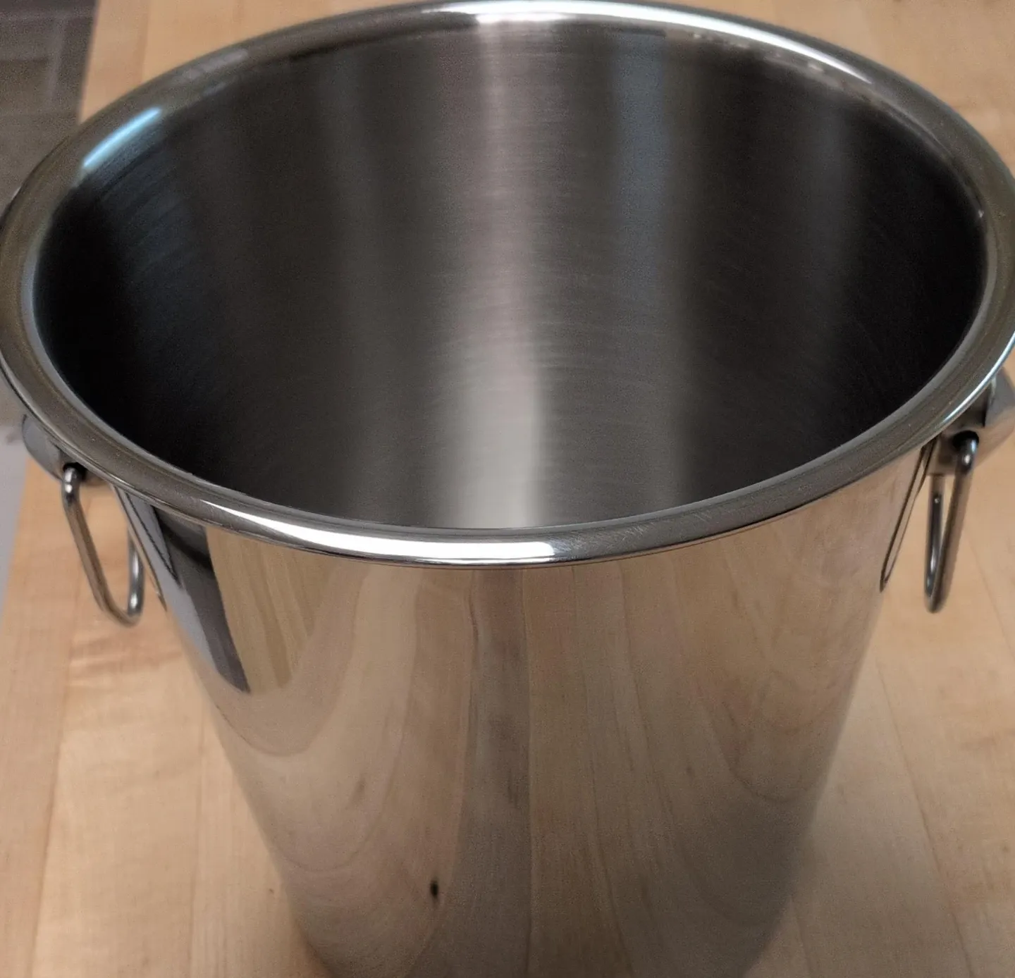 This is a durable stainless steel ice bucket. It features sturdy handles for easy carrying. Great for parties or keeping drinks chilled!