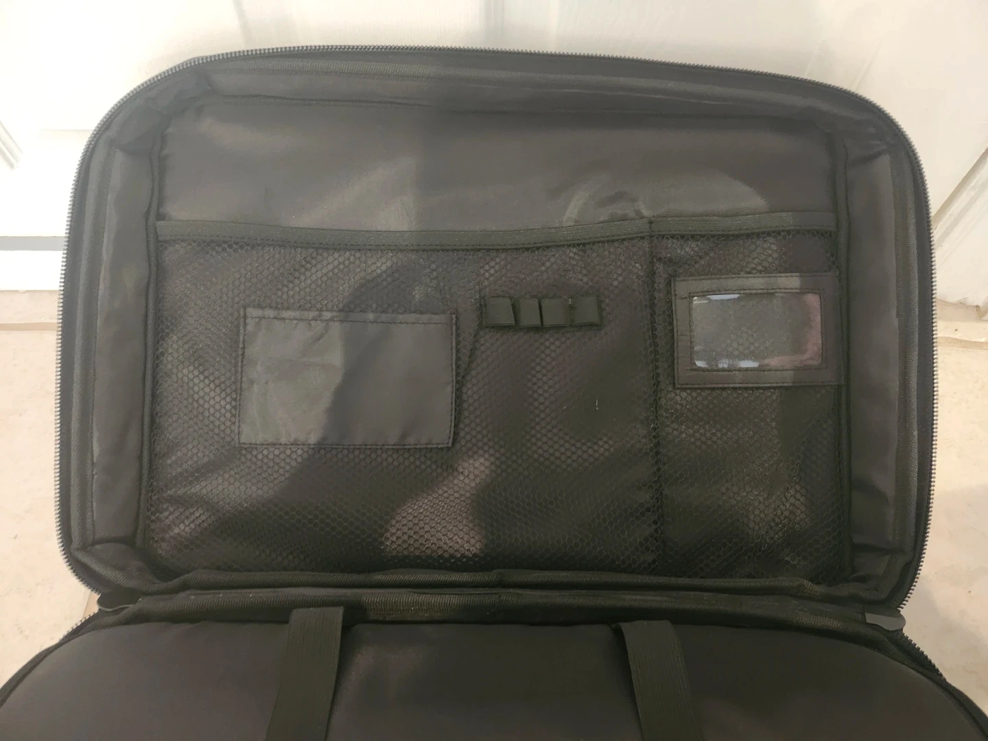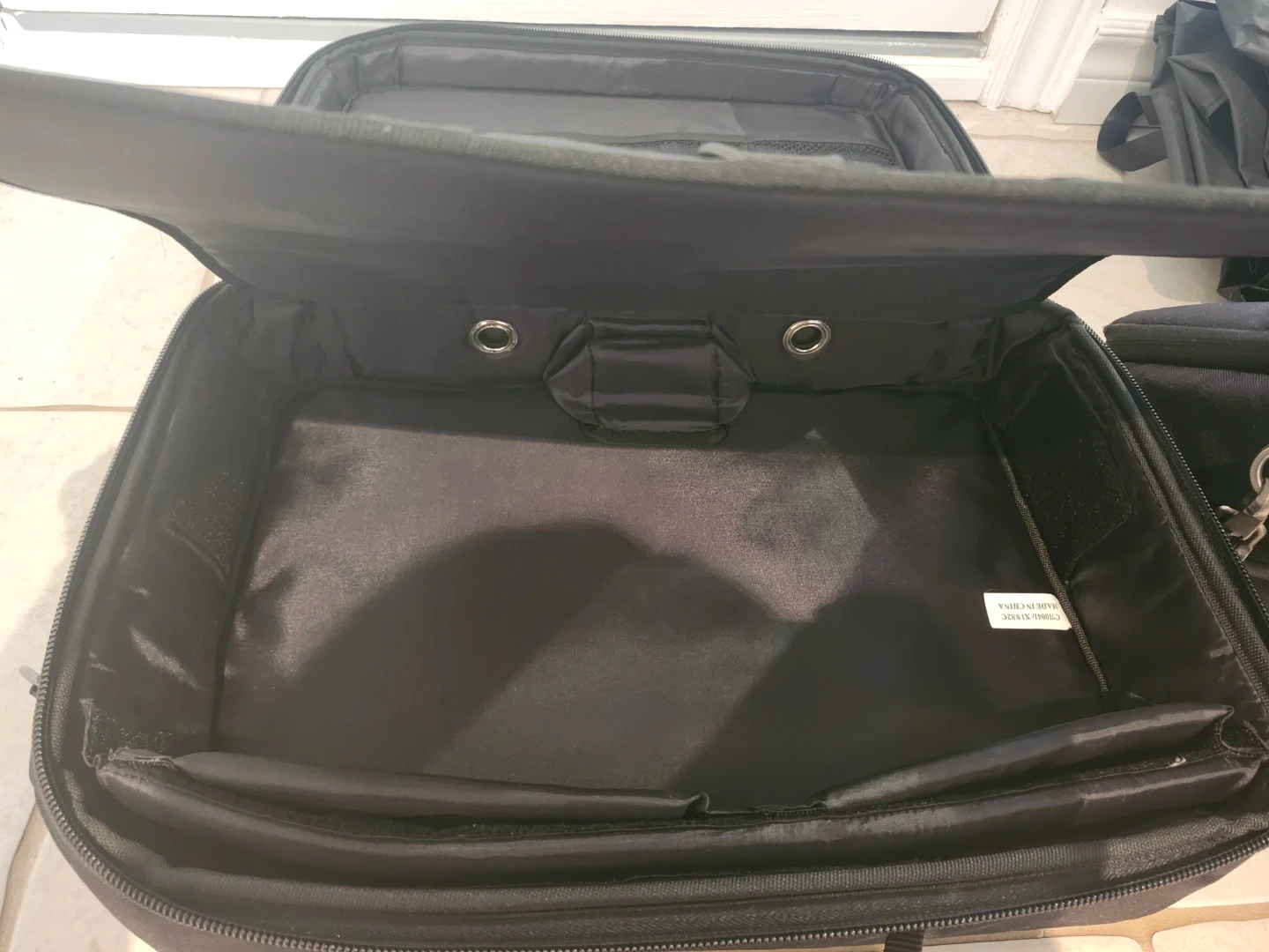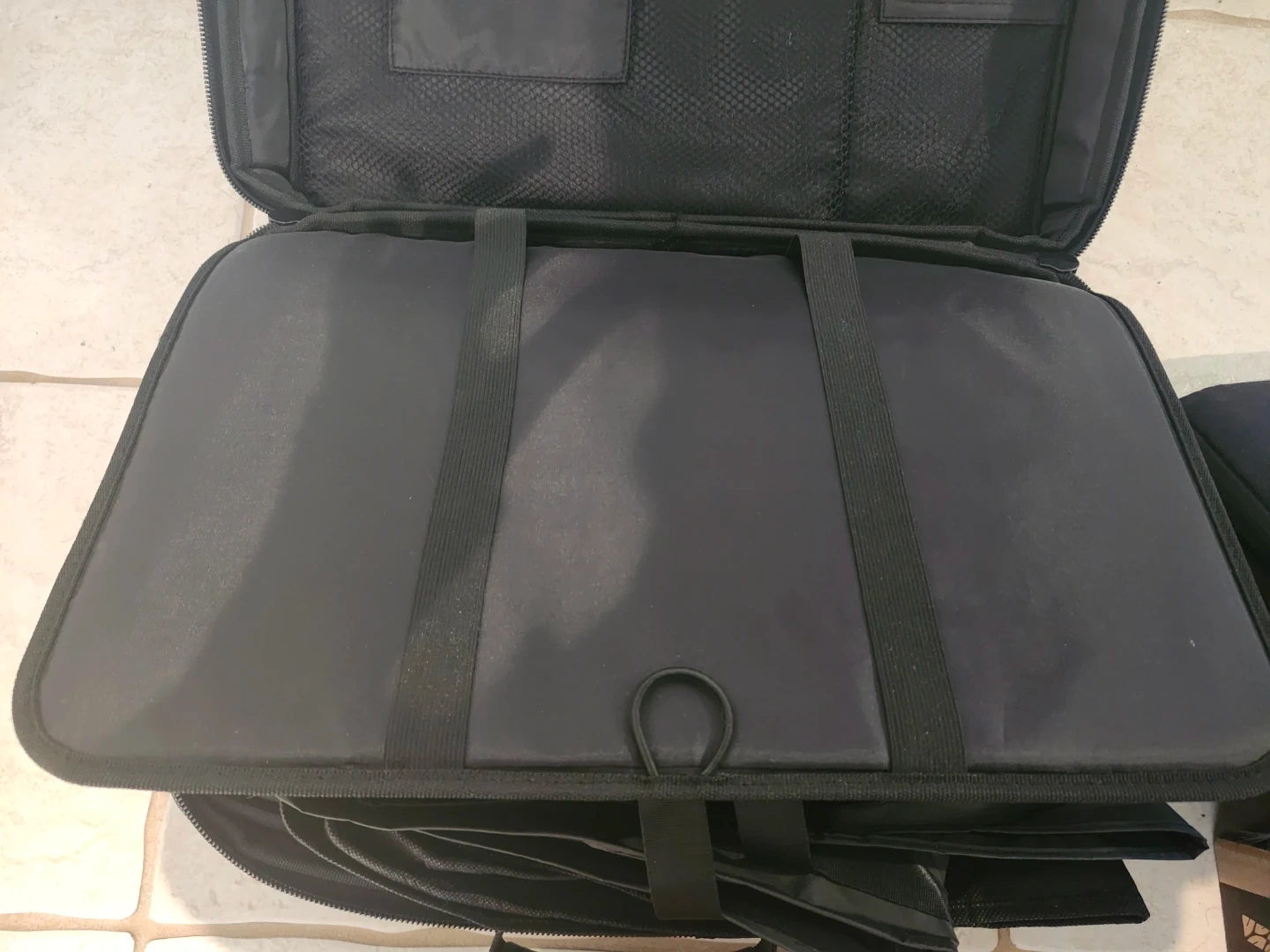 This is a black Bose carrying case. It's made of durable fabric and features multiple compartments for organization. It's great for protecting your Bose equipment while on the go!