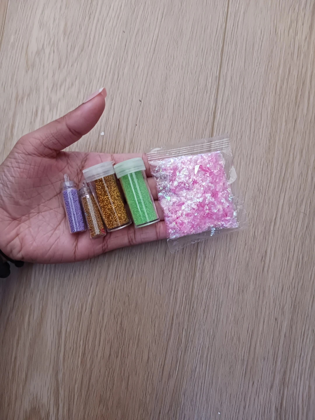 This set includes various small containers and bags filled with glitter, sequins, and small beads. Perfect for crafting and decorating projects! Colors include gold, green, pink, and purple.