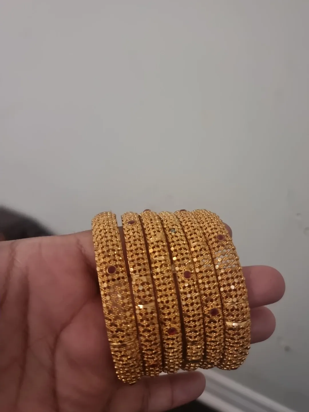 This set includes six bangles, each with an intricate textured design. They're accented with small red stones. This jewellery would add a lovely touch to any outfit!