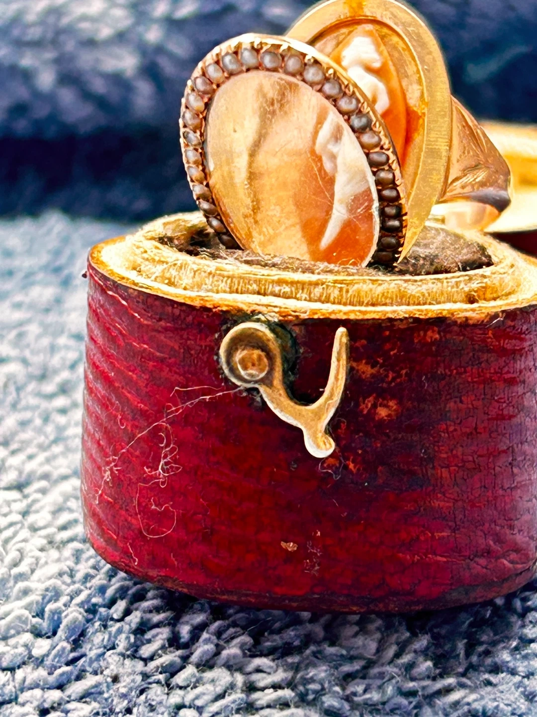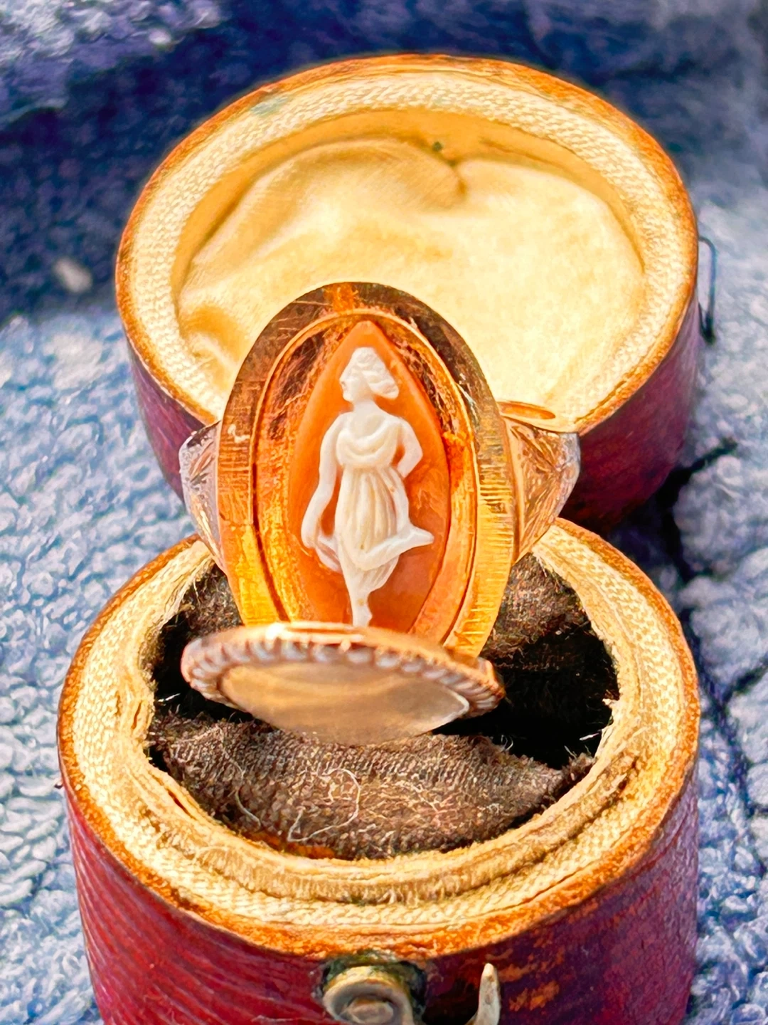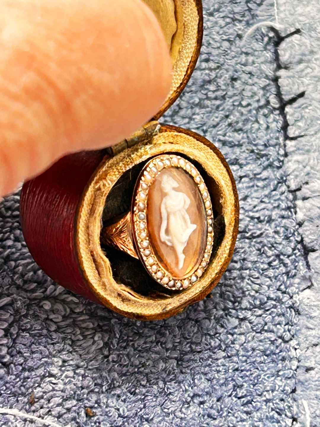 This antique engagement ring features a hand-carved cameo of a dancing lady. It's surrounded by 36 natural pearls and set in solid gold, weighing approximately 4.5 grams. The band is antique engraved. Comes in its original vintage ring box! description: 👉👉👉🛑“Unique antique gold cameo ring. Final price depends on the current gold market. Serious inquiries only—please message me for details.”