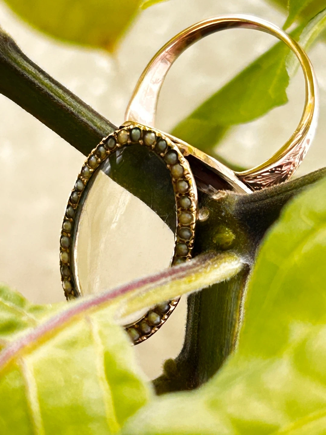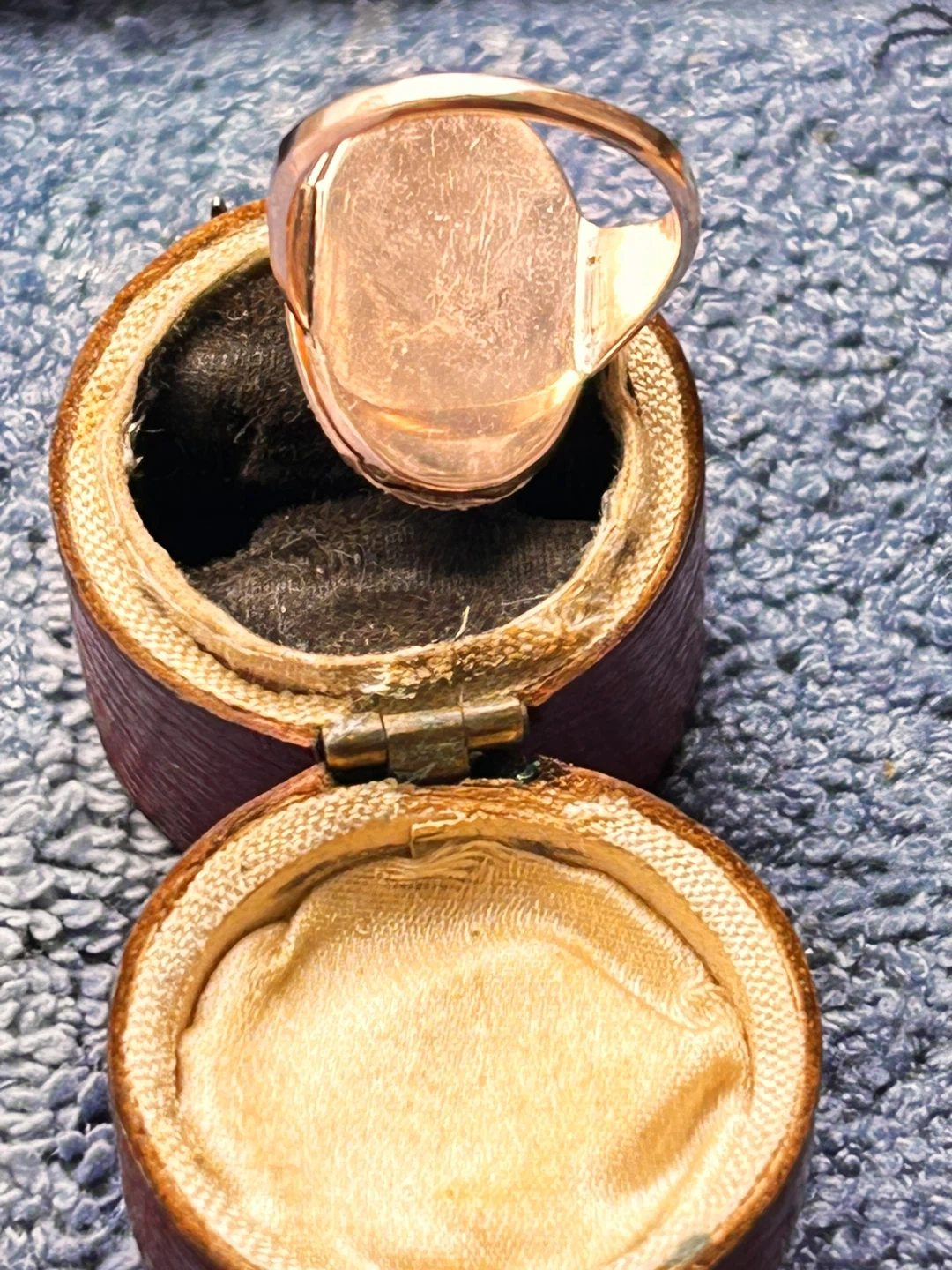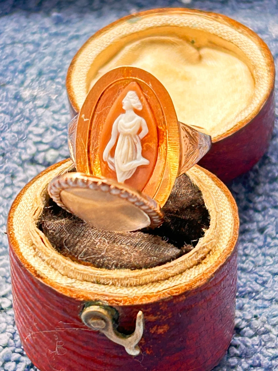 This antique engagement ring features a hand-carved cameo of a dancing lady. It's surrounded by 36 natural pearls and set in solid gold, weighing approximately 4.5 grams. The band is antique engraved. Comes in its original vintage ring box! description: 👉👉👉🛑“Unique antique gold cameo ring. Final price depends on the current gold market. Serious inquiries only—please message me for details.”