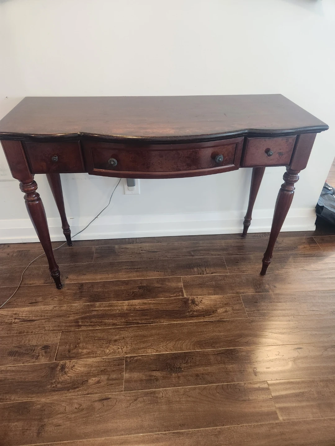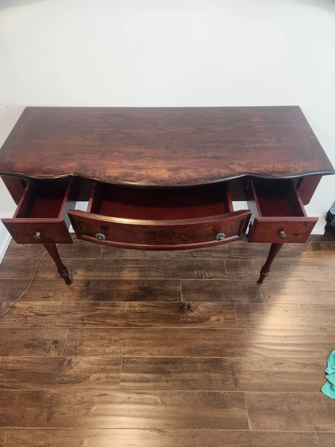 This console table features a beautiful cherry wood finish and a curved front with three drawers for storage. The turned legs add a classic touch. It's a nice piece for an entryway or hallway.