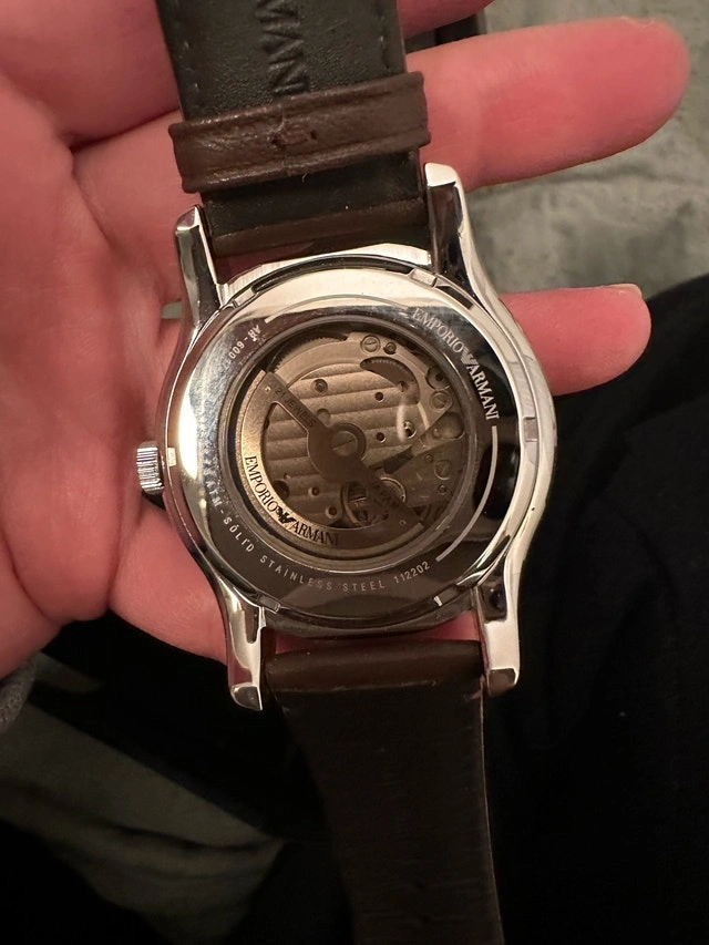 Selling a handsome Emporio Armani Meccanico watch with a stunning automatic movement and elegant brown leather strap. This watch features a skeleton back, allowing you to view the intricate mechanics within. It's a used watch, but has been well cared for and is in great condition. The watch comes with its original box and certificate of authenticity. It’s a real conversation starter!