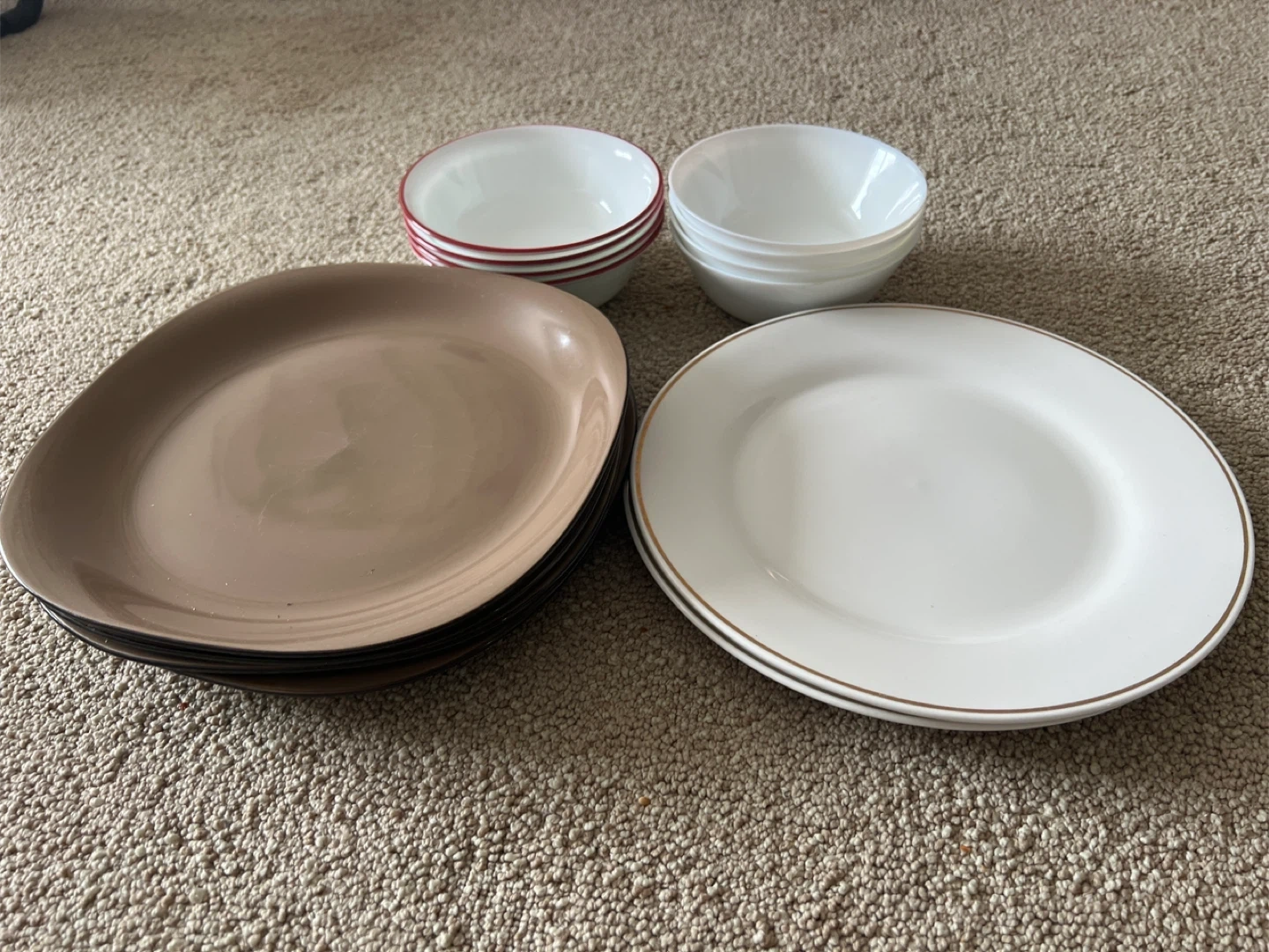 A collection of assorted plates and bowls. Includes 4 brown square plates, 2 white round plates with gold trim, and 4 white bowls with red trim and 4 plain white bowls.