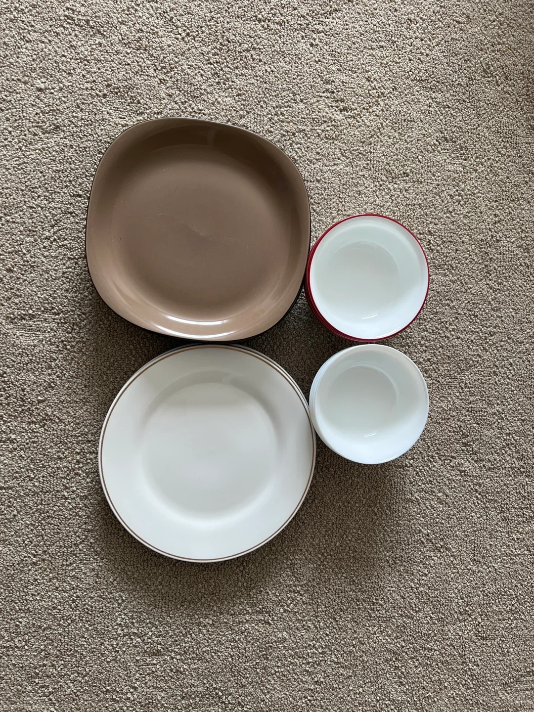 A collection of assorted plates and bowls. Includes 4 brown square plates, 2 white round plates with gold trim, and 4 white bowls with red trim and 4 plain white bowls.