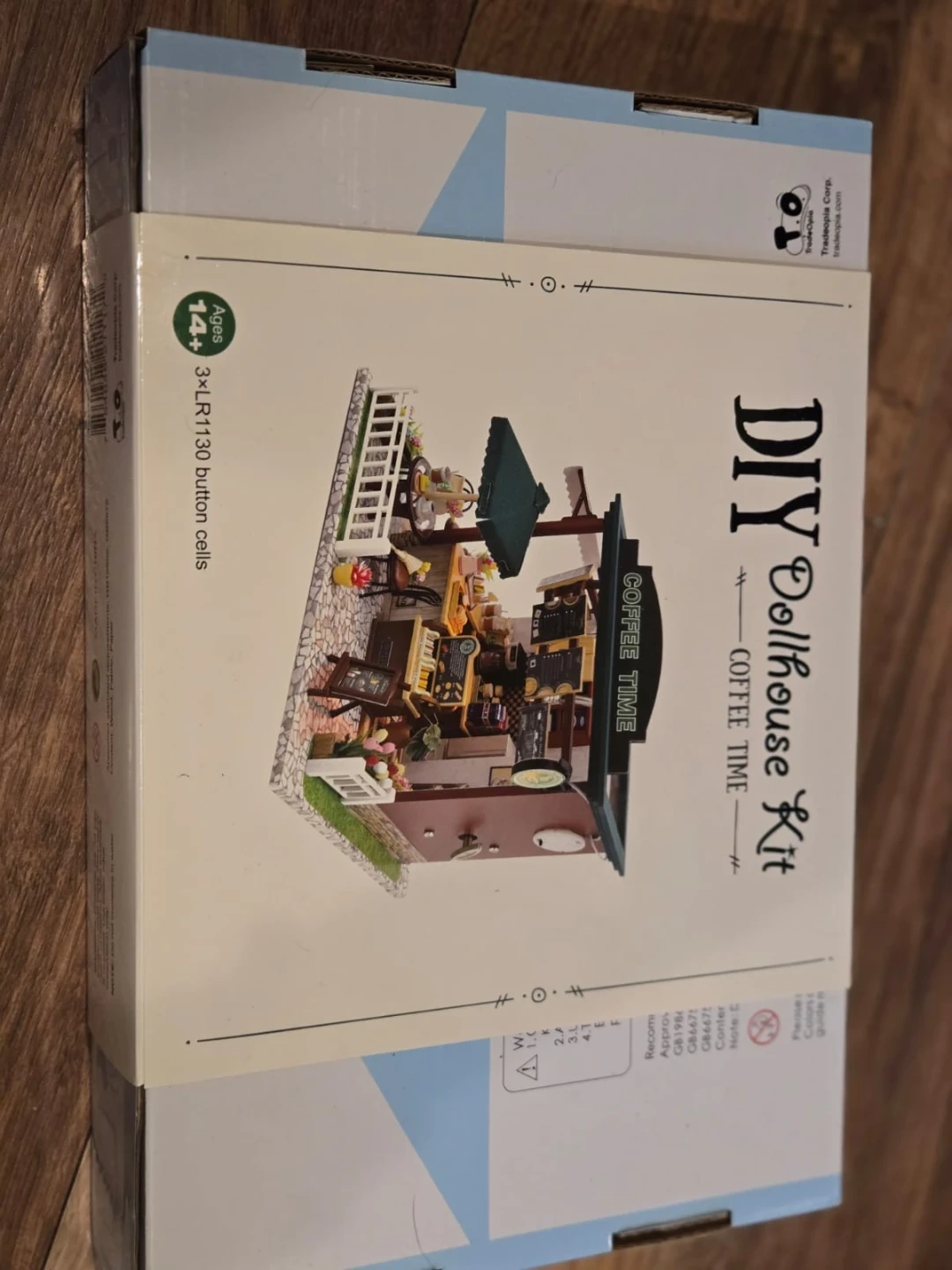This is a DIY Dollhouse Kit featuring a coffee time theme. It's recommended for ages 14 and up. Includes 3x LR1130 button cells.