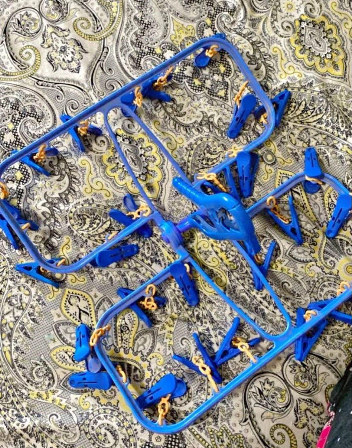 This is a blue plastic clothes drying rack with multiple clips. It's designed for hanging small items to air dry. Its compact design makes it handy for use anywhere.