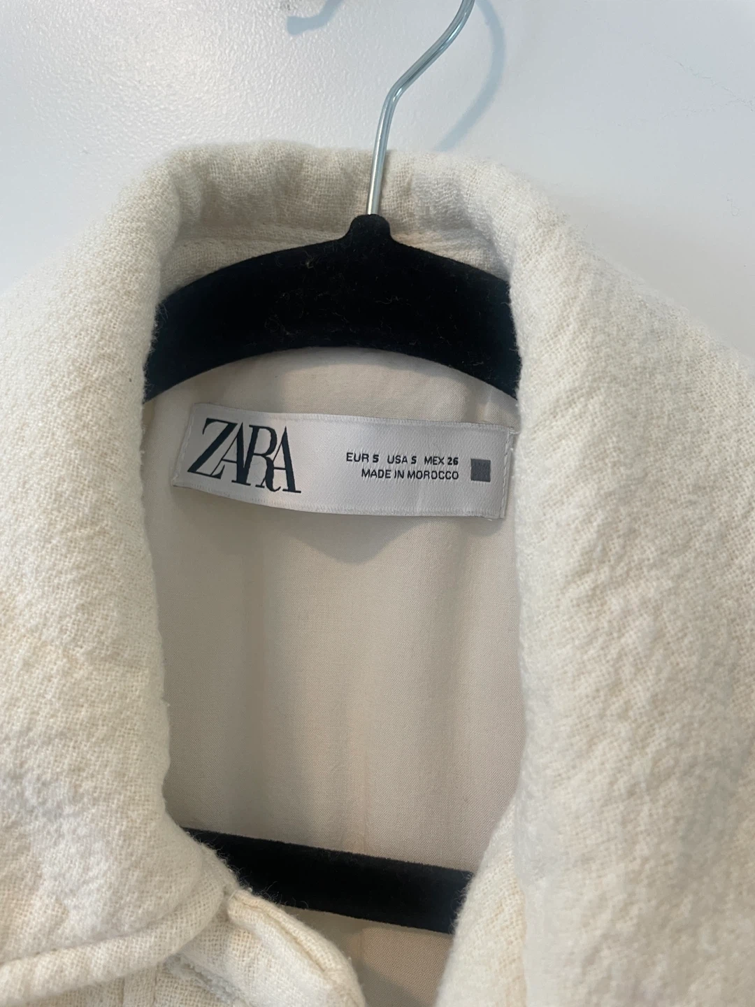 This ZARA jacket comes in an off-white textured fabric. It's a size S (fits S -M) with button-up closure and two chest pockets. Perfect for a stylish layering piece!