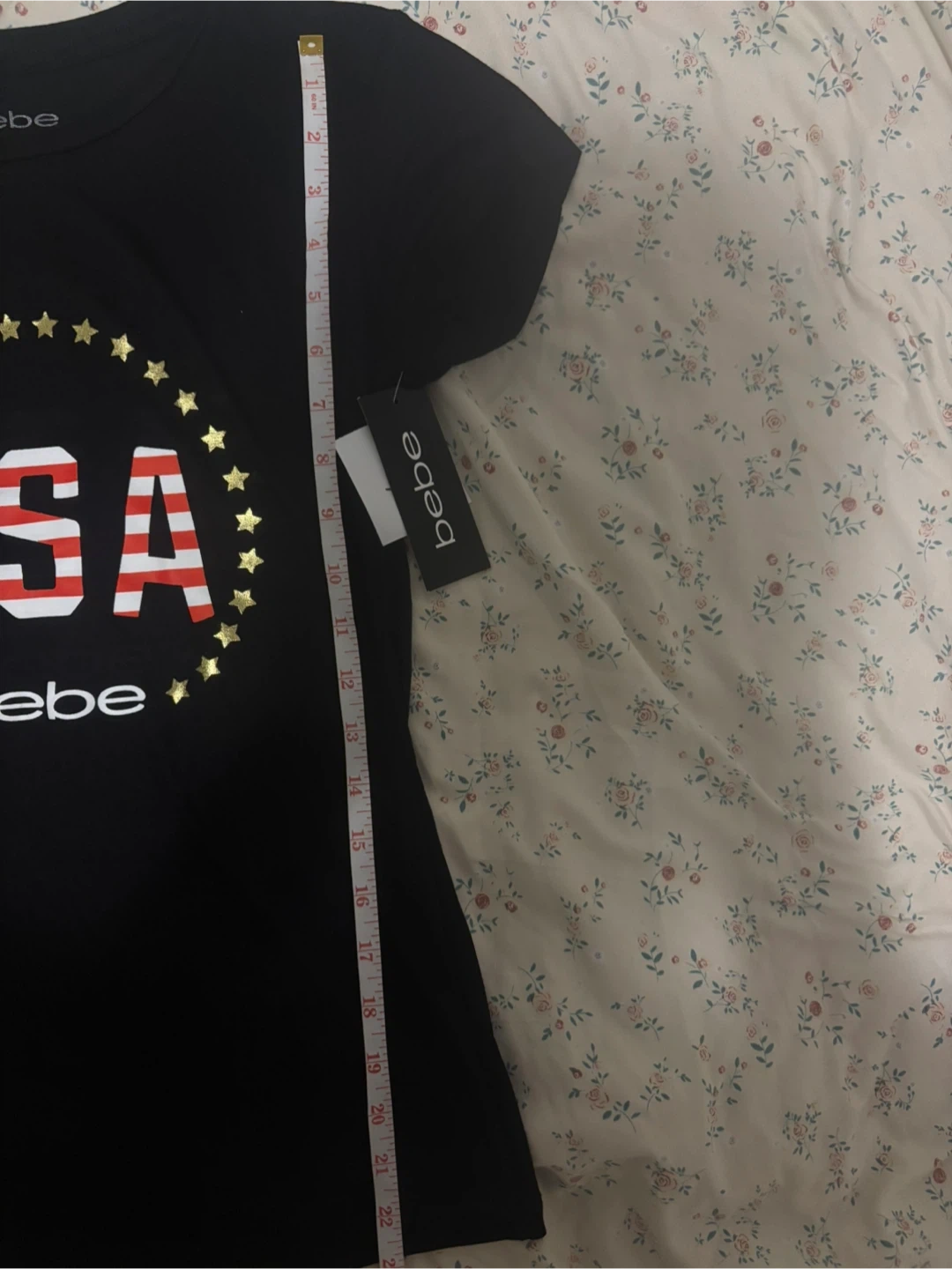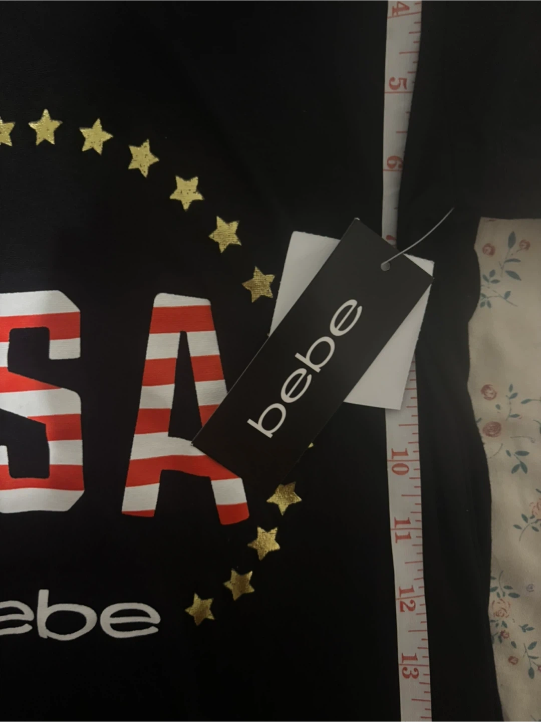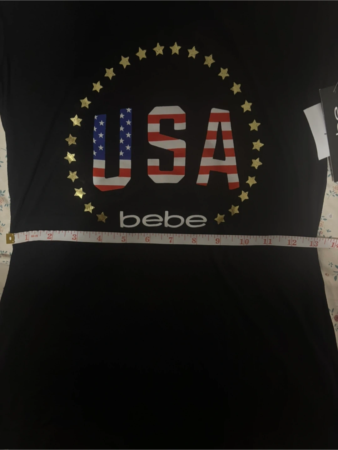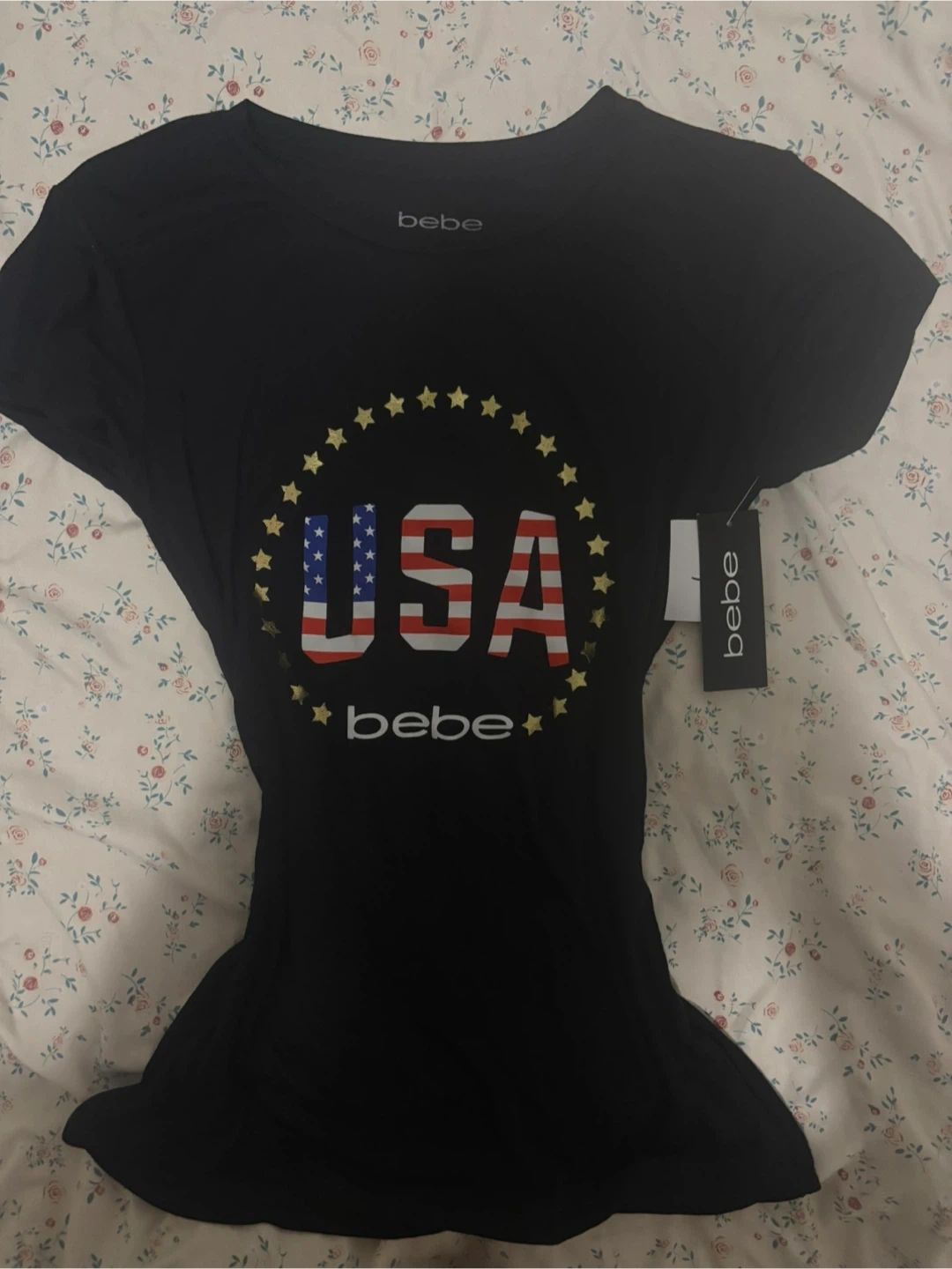 Brand new (with tags )Black short-sleeved t-shirt from Bebe featuring a 'USA' graphic with stars. Size is small. It's made of a soft material.