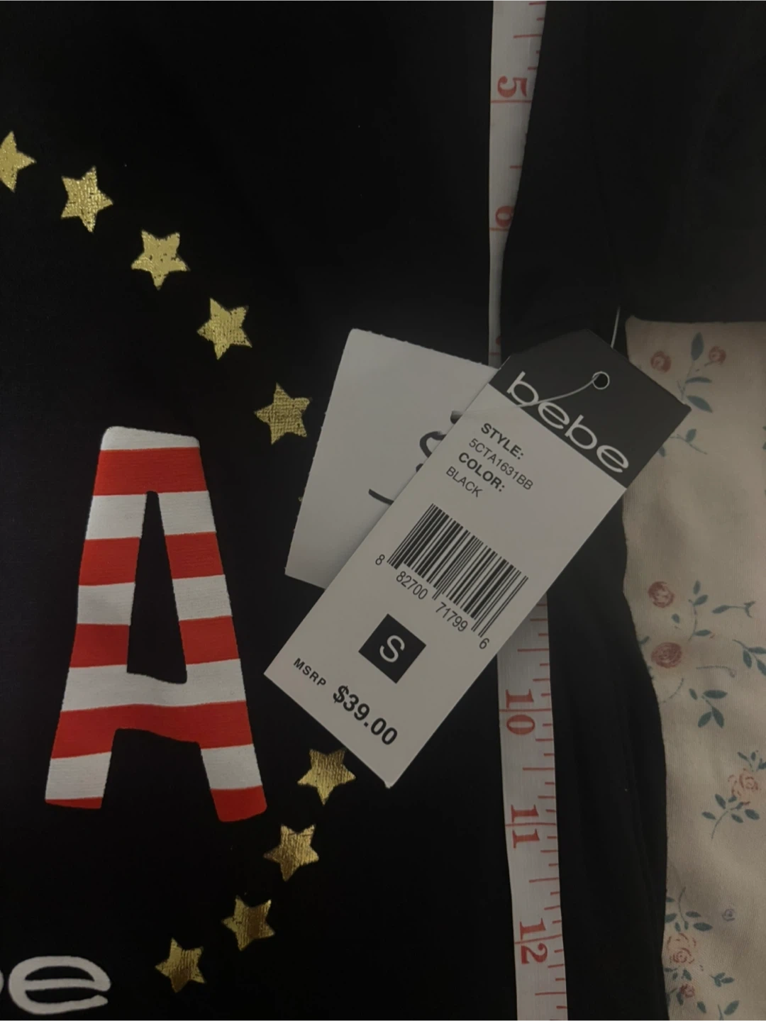 Brand new (with tags )Black short-sleeved t-shirt from Bebe featuring a 'USA' graphic with stars. Size is small. It's made of a soft material.