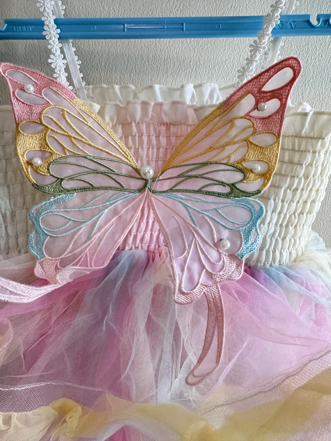 This adorable tutu dress features a ruffled bodice and a layered tulle skirt in pastel rainbow colours. It's embellished with a sparkly butterfly appliqué on the front. Perfect for dress-up or parties!