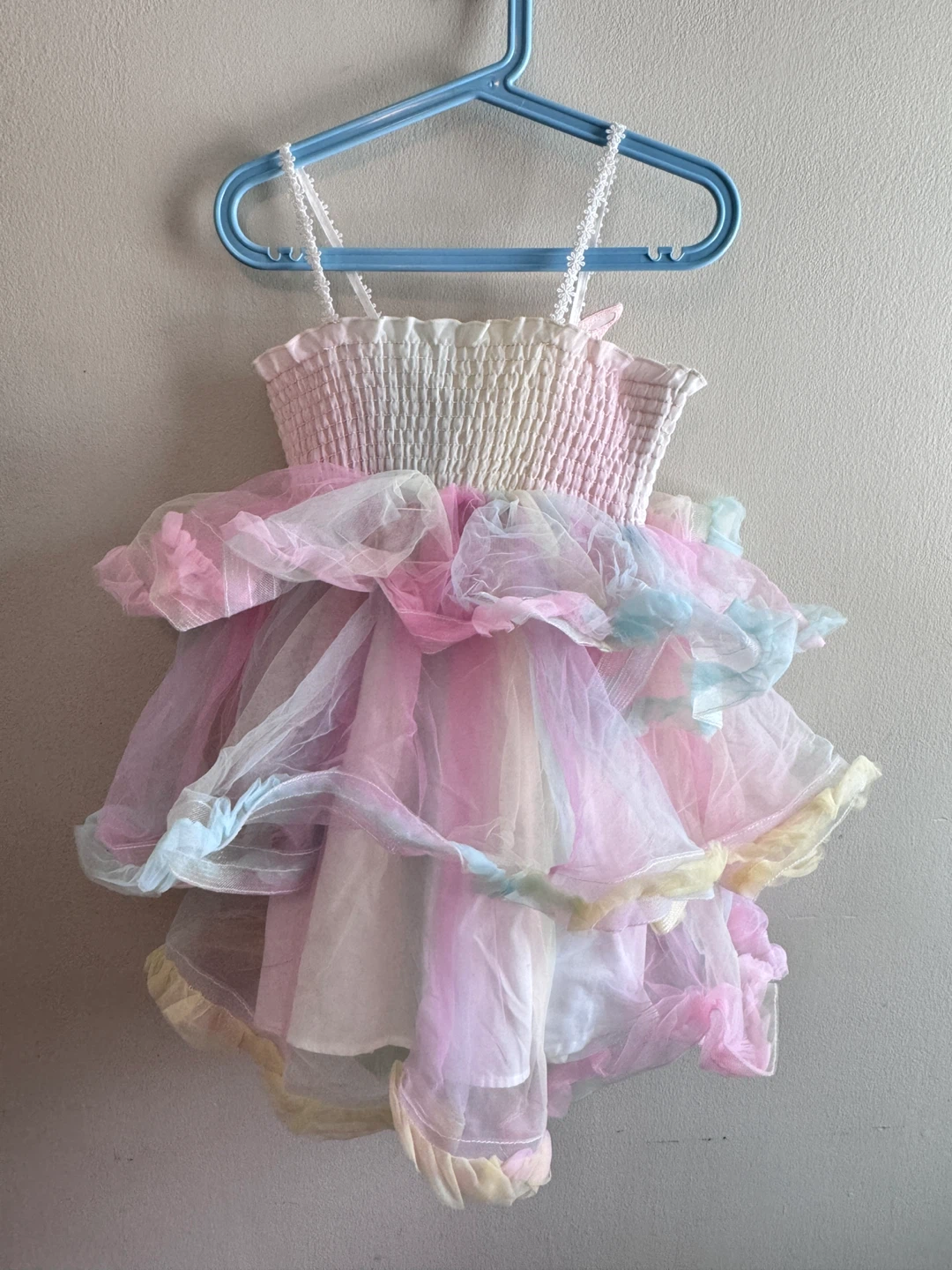This adorable tutu dress features a ruffled bodice and a layered tulle skirt in pastel rainbow colours. It's embellished with a sparkly butterfly appliqué on the front. Perfect for dress-up or parties!