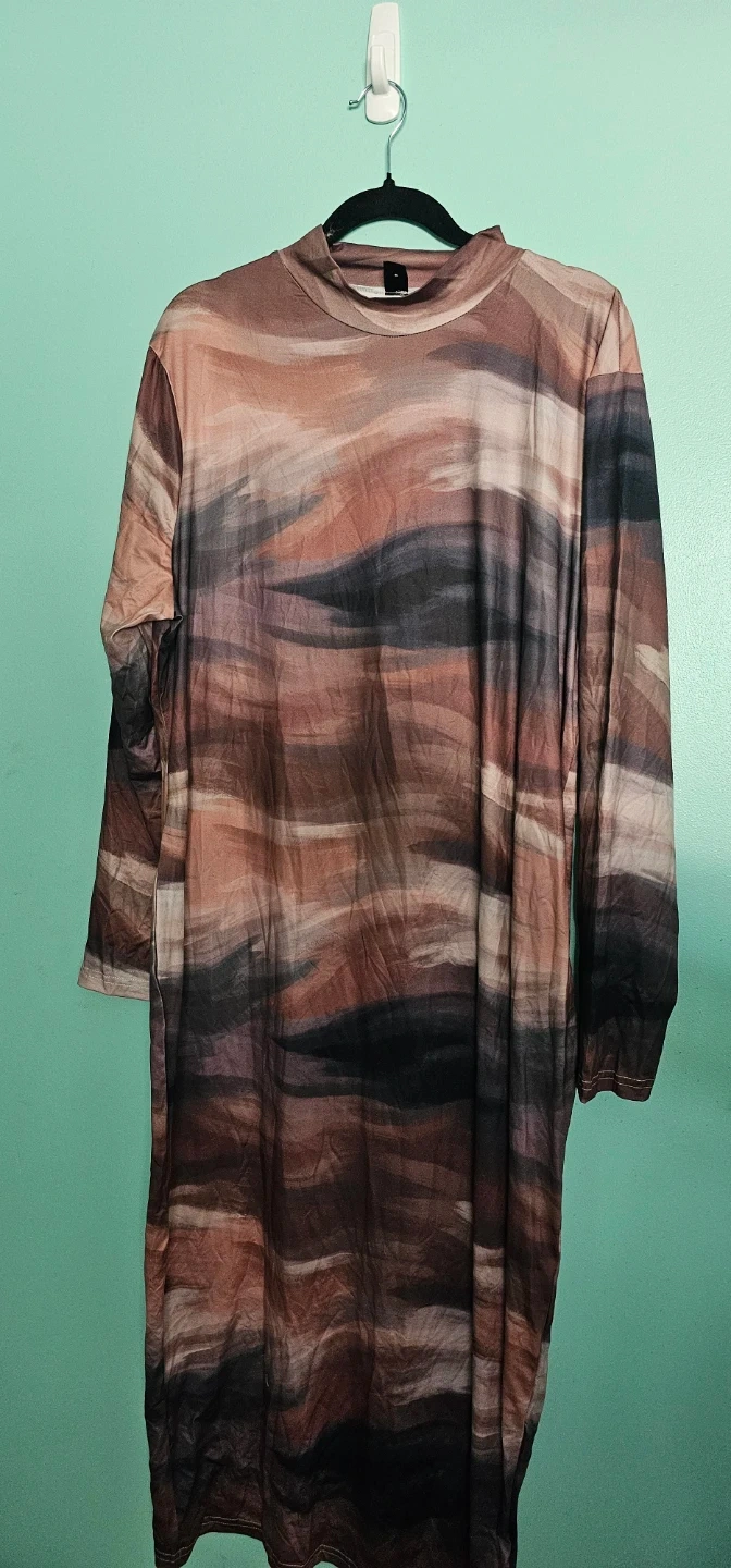 This long-sleeve dress features a mock neck and a bold abstract print. It's made from a sheer, stretchy fabric that drapes beautifully. The dress falls to a midi length.