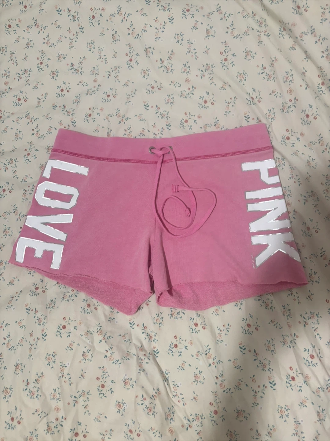 These are pink Victoria's Secret "LOVE PINK" sweat shorts with silver lettering. Made of a soft cotton blend for comfort. Elastic waistband with drawstring. Waist measures approximately 15 inches across.