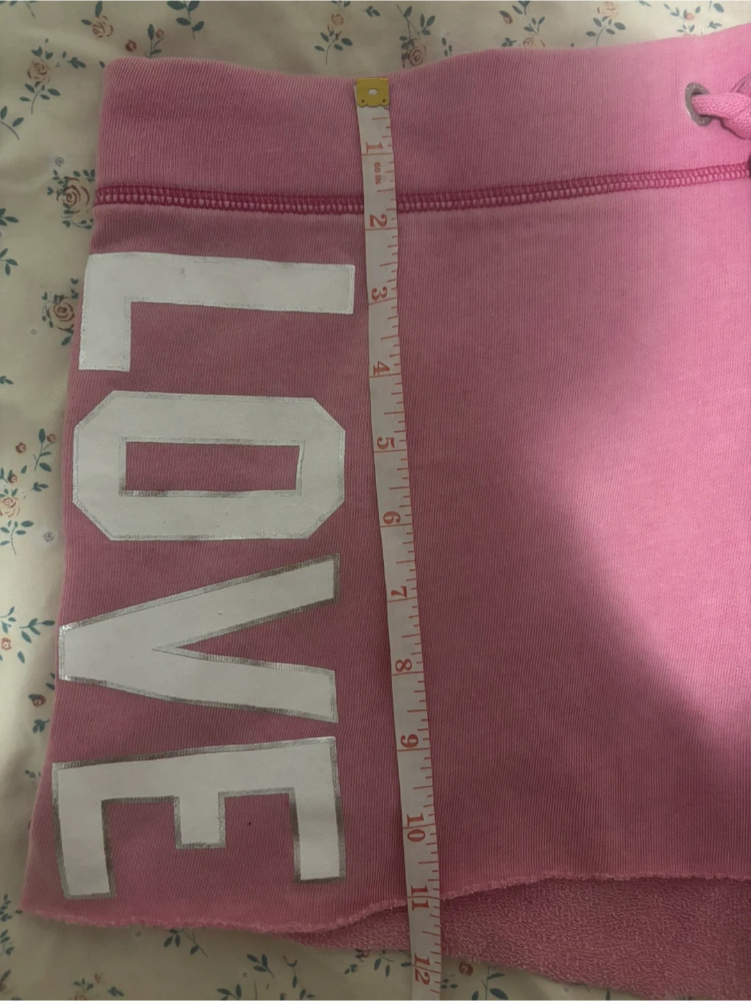 These are pink Victoria's Secret "LOVE PINK" sweat shorts with silver lettering. Made of a soft cotton blend for comfort. Elastic waistband with drawstring. Waist measures approximately 15 inches across.