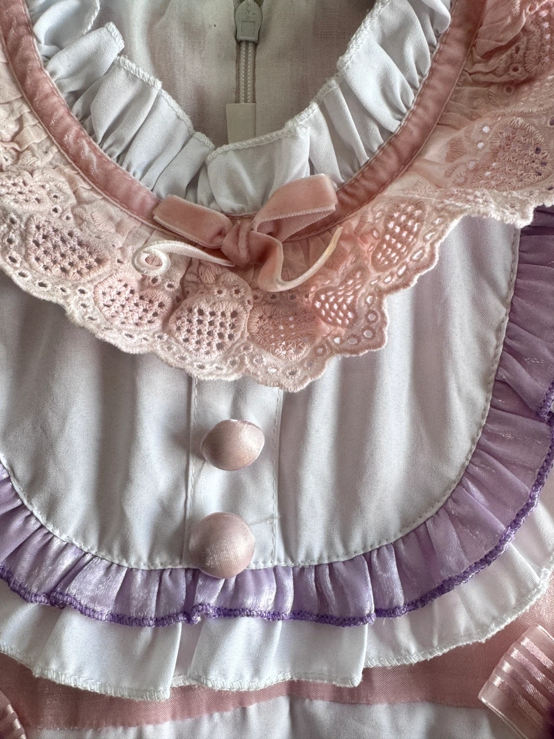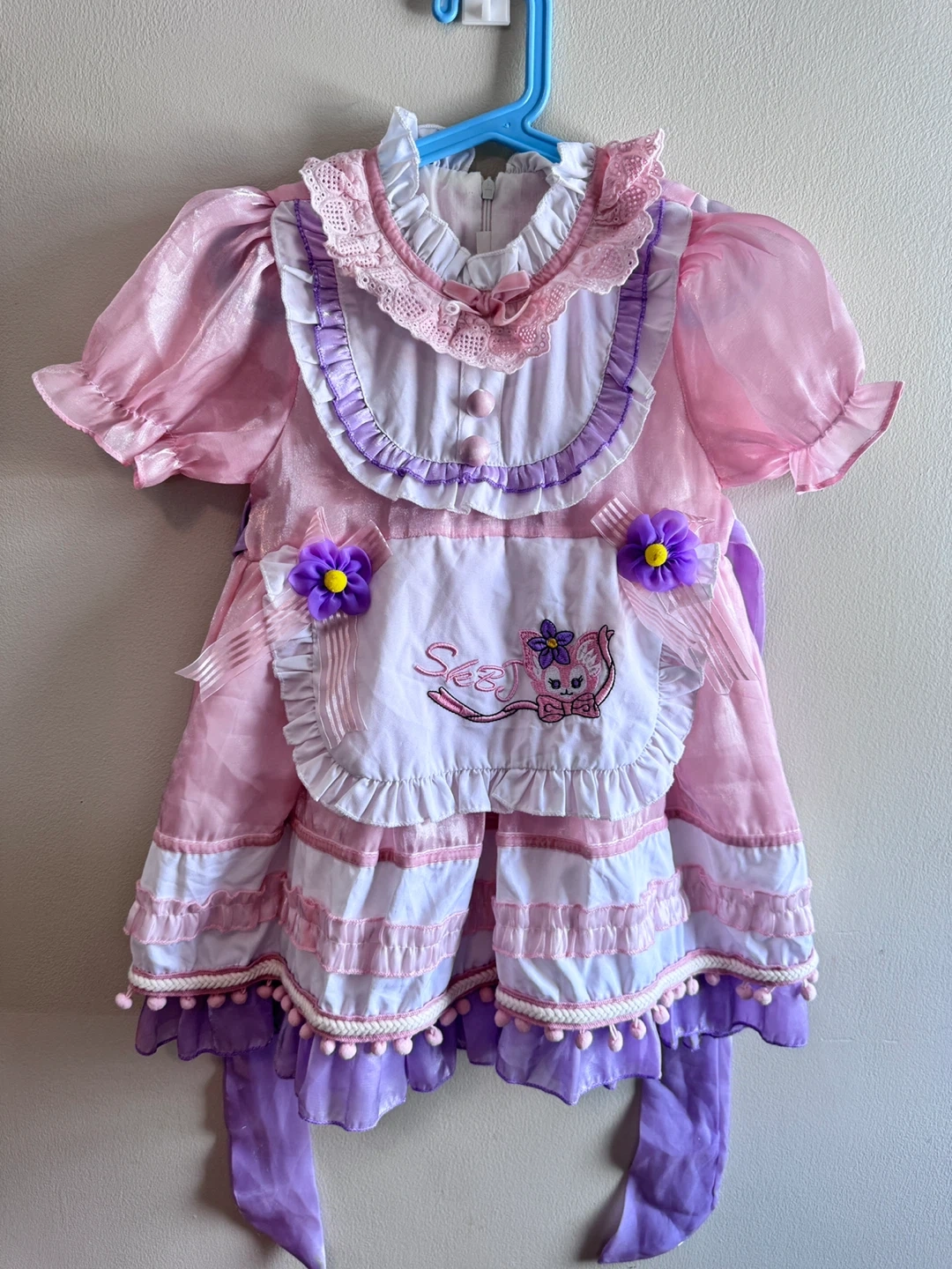 This adorable pink dress features a cute Linabell embroidery on the front bib and ruffled details. It has a layered skirt with pom-pom trim and sheer puff sleeves. A darling outfit for any little one!